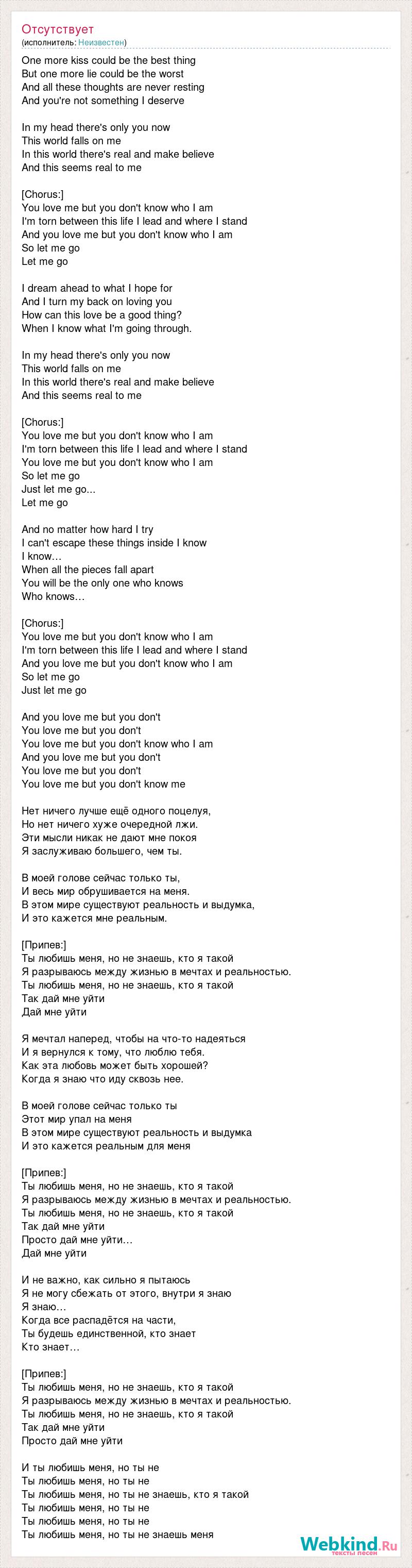 One more kiss could be the best thing But one more lie could be the worst And all these thoughts are never resting And you're not something I deserve In my head there's only you now This world falls on me In this world there's real and make believe And this seems real to me [Chorus:] You love me but you don't know who I am I'm torn between this life I lead and where I stand And you love me but you don't know who I am So let me go Let me go I dream ahead to what I hope for And I turn my back on loving you How can this love be a good thing? When I know what I'm going through. In my head there's only you now This world falls on me In this world there's real and make believe And this seems real to me [Chorus:] You love me but you don't know who I am I'm torn between this life I lead and where I stand You love me but you don't know who I am So let me go Just let me go... Let me go And no matter how hard I try I can't escape these things inside I know I know… When all the pieces fall apart You will be the only one who knows Who knows… [Chorus:] You love me but you don't know who I am I'm torn between this life I lead and where I stand And you love me but you don't know who I am So let me go Just let me go And you love me but you don't You love me but you don't You love me but you don't know who I am And you love me but you don't You love me but you don't You love me but you don't know me Нет ничего лучше ещё одного поцелуя, Но нет ничего хуже очередной лжи. Эти мысли никак не дают мне покоя Я заслуживаю большего, чем ты. В моей голове сейчас только ты, И весь мир обрушивается на меня. В этом мире существуют реальность и выдумка, И это кажется мне реальным. [Припев:] Ты любишь меня, но не знаешь, кто я такой Я разрываюсь между жизнью в мечтах и реальностью. Ты любишь меня, но не знаешь, кто я такой Так дай мне уйти Дай мне уйти Я мечтал наперед, чтобы на что-то надеяться И я вернулся к тому, что люблю тебя. Как эта любовь может быть хорошей? Когда я знаю что иду сквозь нее. В моей голове сейчас только ты Этот мир упал на меня В этом мире существуют реальность и выдумка И это кажется реальным для меня [Припев:] Ты любишь меня, но не знаешь, кто я такой Я разрываюсь между жизнью в мечтах и реальностью. Ты любишь меня, но не знаешь, кто я такой Так дай мне уйти Просто дай мне уйти… Дай мне уйти И не важно, как сильно я пытаюсь Я не могу сбежать от этого, внутри я знаю Я знаю… Когда все распадётся на части, Ты будешь единственной, кто знает Кто знает… [Припев:] Ты любишь меня, но не знаешь, кто я такой Я разрываюсь между жизнью в мечтах и реальностью. Ты любишь меня, но не знаешь, кто я такой Так дай мне уйти Просто дай мне уйти И ты любишь меня, но ты не Ты любишь меня, но ты не Ты любишь меня, но ты не знаешь, кто я такой Ты любишь меня, но ты не Ты любишь меня, но ты не Ты любишь меня, но ты не знаешь меня