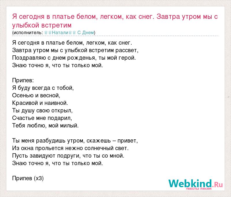 Я сегодня в платье белом, легком, как снег. Завтра утром мы с улыбкой встретим рассвет, Поздравляю с днем рожденья, ты мой герой. Знаю точно я, что ты только мой. Припев: Я буду всегда с тобой, Осенью и весной, Красивой и наивной. Ты душу свою открыл, Счастье мне подарил, Тебя люблю, мой милый. Ты меня разбудишь утром, скажешь – привет, Из окна прольется нежно солнечный свет. Пусть завидуют подруги, что ты со мной. Знаю точно я, что ты только мой. Припев (х3)