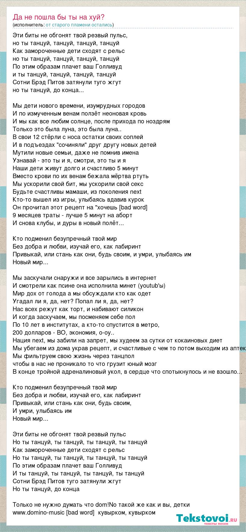 Эти биты не обгонят твой резвый пульс, но ты танцуй, танцуй, танцуй, танцуй Как замороченные дети сходят с рельс но ты танцуй, танцуй, танцуй, танцуй По этим образам плачет ваш Голливуд и ты танцуй, танцуй, танцуй, танцуй Сотни Брэд Питов затянули туго жгут но ты танцуй, до конца... Мы дети нового времени, изумрудных городов И по измученным венам ползёт неоновая кровь И мы как все любим солнце, после прихода по ноздрям Только это была луна, это была луна.. В свои 12 стёрли с носа остатки своих соплей И в подъездах "сочиняли" друг другу новых детей Мутили новые семьи, даже не помнив имена Узнавай - это ты и я, смотри, это ты и я Наши дети живут долго и счастливо 5 минут Вместо крови по их венам бежала мёртва ртуть Мы ускорили свой бит, мы ускорили свой секс Будьте счастливы мамаши, из поколения next Кто-то вышел из игры, улыбаясь вдавив курок Он прочитал этот рецепт на "хочешь [bad word] 9 месяцев траты - лучше 5 минут на аборт И снова клубы, и дуры в новый полёт... Кто подменил безупречный твой мир Без добра и любви, изучай его, как лабиринт Привыкай, или стань как они, будь своим, и умри, улыбаясь им Новый мир... Мы заскучали снаружи и все зарылись в интернет И смотрели как псине она исполнила минет (youtub'ы) Мир дох от голода а мы обсуждали кто как одет Угадал ли я, да, нет? Попал ли я, да, нет? Нас всех режут как торт, и набивают силикон И когда заскучаем, мы посменяем себе пол По 10 лет в институтах, а кто-то спустится в метро, 200 долларов - ВО, экономия, о-оу.. Нация next, мы забили на запрет, мы худеем за сутки от кокаиновых диет Мы убегаем из дома украв рецепт, и счастливые с чем то потом выходим из аптек Мы фильтруем свою жизнь через танцпол чтобы в нас не проникало то что грузит юный мозг В конце тройной адреналиновый укол, в сердце что спотыкнулось и не взошло... Кто подменил безупречный твой мир Без добра и любви, изучай его, как лабиринт Привыкай, или стань как они, будь своим, И умри, улыбаясь им Новый мир... Эти биты не обгонят твой резвый пульс Но ты танцуй, ты танцуй, ты танцуй, ты танцуй Как замороченные дети сходят с рельс Но ты танцуй, ты танцуй, ты танцуй, ты танцуй По этим образам плачет ваш Голливуд И ты танцуй, ты танцуй, ты танцуй, ты танцуй Сотни Брэд Питов туго затянули жгут Но ты танцуй, до конца Только не нужно думать что dom!No такой же как и вы, детки www.domino-music точечка com, кувырком, кувырком