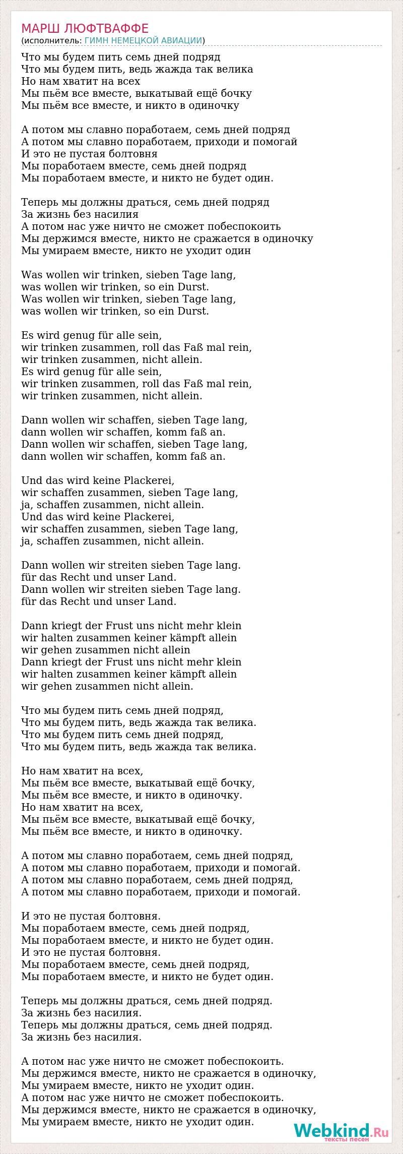 Что мы будем пить семь дней подряд Что мы будем пить, ведь жажда так велика Но нам хватит на всех Мы пьём все вместе, выкатывай ещё бочку Мы пьём все вместе, и никто в одиночку А потом мы славно поработаем, семь дней подряд А потом мы славно поработаем, приходи и помогай И это не пустая болтовня Мы поработаем вместе, семь дней подряд Мы поработаем вместе, и никто не будет один. Теперь мы должны драться, семь дней подряд За жизнь без насилия А потом нас уже ничто не сможет побеспокоить Мы держимся вместе, никто не сражаетcя в одиночку Мы умираем вместе, никто не уходит один Was wollen wir trinken, sieben Tage lang, was wollen wir trinken, so ein Durst. Was wollen wir trinken, sieben Tage lang, was wollen wir trinken, so ein Durst. Es wird genug für alle sein, wir trinken zusammen, roll das Faß mal rein, wir trinken zusammen, nicht allein. Es wird genug für alle sein, wir trinken zusammen, roll das Faß mal rein, wir trinken zusammen, nicht allein. Dann wollen wir schaffen, sieben Tage lang, dann wollen wir schaffen, komm faß an. Dann wollen wir schaffen, sieben Tage lang, dann wollen wir schaffen, komm faß an. Und das wird keine Plackerei, wir schaffen zusammen, sieben Tage lang, ja, schaffen zusammen, nicht allein. Und das wird keine Plackerei, wir schaffen zusammen, sieben Tage lang, ja, schaffen zusammen, nicht allein. Dann wollen wir streiten sieben Tage lang. für das Recht und unser Land. Dann wollen wir streiten sieben Tage lang. für das Recht und unser Land. Dann kriegt der Frust uns nicht mehr klein wir halten zusammen keiner kämpft allein wir gehen zusammen nicht allein Dann kriegt der Frust uns nicht mehr klein wir halten zusammen keiner kämpft allein wir gehen zusammen nicht allein. Что мы будем пить семь дней подряд, Что мы будем пить, ведь жажда так велика. Что мы будем пить семь дней подряд, Что мы будем пить, ведь жажда так велика. Но нам хватит на всех, Мы пьём все вместе, выкатывай ещё бочку, Мы пьём все вместе, и никто в одиночку. Но нам хватит на всех, Мы пьём все вместе, выкатывай ещё бочку, Мы пьём все вместе, и никто в одиночку. А потом мы славно поработаем, семь дней подряд, А потом мы славно поработаем, приходи и помогай. А потом мы славно поработаем, семь дней подряд, А потом мы славно поработаем, приходи и помогай. И это не пустая болтовня. Мы поработаем вместе, семь дней подряд, Мы поработаем вместе, и никто не будет один. И это не пустая болтовня. Мы поработаем вместе, семь дней подряд, Мы поработаем вместе, и никто не будет один. Теперь мы должны драться, семь дней подряд. За жизнь без насилия. Теперь мы должны драться, семь дней подряд. За жизнь без насилия. А потом нас уже ничто не сможет побеспокоить. Мы держимся вместе, никто не сражаетcя в одиночку, Мы умираем вместе, никто не уходит один. А потом нас уже ничто не сможет побеспокоить. Мы держимся вместе, никто не сражаетcя в одиночку, Мы умираем вместе, никто не уходит один.