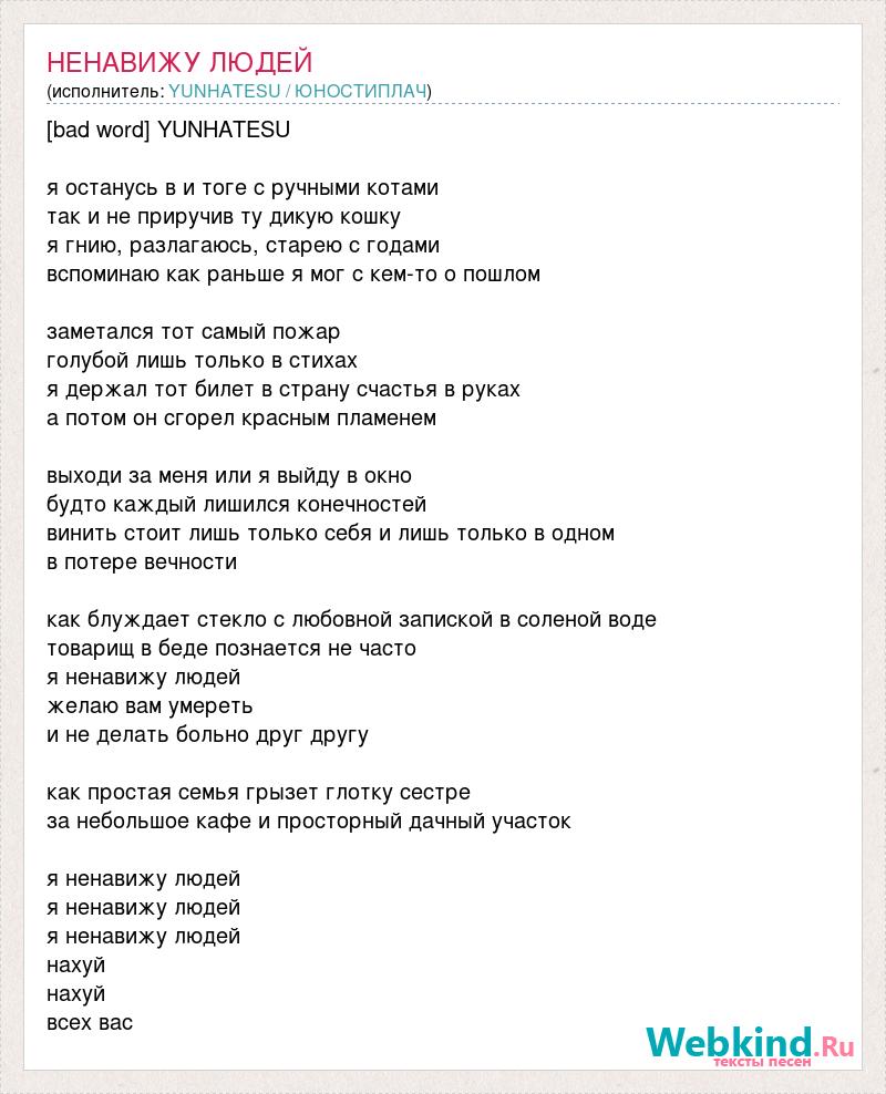 [bad word] YUNHATESU я останусь в и тоге с ручными котами так и не приручив ту дикую кошку я гнию, разлагаюсь, старею с годами вспоминаю как раньше я мог с кем-то о пошлом заметался тот самый пожар голубой лишь только в стихах я держал тот билет в страну счастья в руках а потом он сгорел красным пламенем выходи за меня или я выйду в окно будто каждый лишился конечностей винить стоит лишь только себя и лишь только в одном в потере вечности как блуждает стекло с любовной запиской в соленой воде товарищ в беде познается не часто я ненавижу людей желаю вам умереть и не делать больно друг другу как простая семья грызет глотку сестре за небольшое кафе и просторный дачный участок я ненавижу людей я ненавижу людей я ненавижу людей нахуй нахуй всех вас