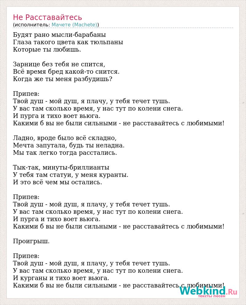 Будят рано мысли-барабаны Глаза такого цвета как тюльпаны Которые ты любишь. Зарнице без тебя не спится, Всё время бред какой-то снится. Когда же ты меня разбудишь? Припев: Твой душ - мой душ, я плачу, у тебя течет тушь. У вас там сколько время, у нас тут по колени снега. И пурга и тихо воет вьюга. Какими б вы не были сильными - не расставайтесь с любимыми! Ладно, вроде было всё складно, Мечта запутала, будь ты неладна. Мы так легко тогда расстались. Тык-так, минуты-бриллианты У тебя там статуи, у меня куранты. И это всё чем мы остались. Припев: Твой душ - мой душ, я плачу, у тебя течет тушь. У вас там сколько время, у нас тут по колени снега. И пурга и тихо воет вьюга. Какими б вы не были сильными - не расставайтесь с любимыми! Проигрыш. Припев: Твой душ - мой душ, я плачу, у тебя течет тушь. У вас там сколько время, у нас тут по колени снега. И курганы и тихо воет вьюга. Какими б вы не были сильными - не расставайтесь с любимыми!