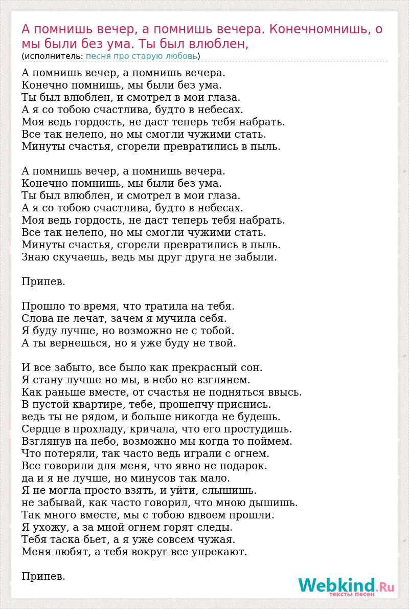А помнишь вечер, а помнишь вечера. Конечно помнишь, мы были без ума. Ты был влюблен, и смотрел в мои глаза. А я со тобою счастлива, будто в небесах. Моя ведь гордость, не даст теперь тебя набрать. Все так нелепо, но мы смогли чужими стать. Минуты счастья, сгорели превратились в пыль. А помнишь вечер, а помнишь вечера. Конечно помнишь, мы были без ума. Ты был влюблен, и смотрел в мои глаза. А я со тобою счастлива, будто в небесах. Моя ведь гордость, не даст теперь тебя набрать. Все так нелепо, но мы смогли чужими стать. Минуты счастья, сгорели превратились в пыль. Знаю скучаешь, ведь мы друг друга не забыли. Припев. Прошло то время, что тратила на тебя. Слова не лечат, зачем я мучила себя. Я буду лучше, но возможно не с тобой. А ты вернешься, но я уже буду не твой. И все забыто, все было как прекрасный сон. Я стану лучше но мы, в небо не взглянем. Как раньше вместе, от счастья не подняться ввысь. В пустой квартире, тебе, прошепчу приснись. ведь ты не рядом, и больше никогда не будешь. Сердце в прохладу, кричала, что его простудишь. Взглянув на небо, возможно мы когда то поймем. Что потеряли, так часто ведь играли с огнем. Все говорили для меня, что явно не подарок. да и я не лучше, но минусов так мало. Я не могла просто взять, и уйти, слышишь. не забывай, как часто говорил, что мною дышишь. Так много вместе, мы с тобою вдвоем прошли. Я ухожу, а за мной огнем горят следы. Тебя таска бьет, а я уже совсем чужая. Меня любят, а тебя вокруг все упрекают. Припев.
