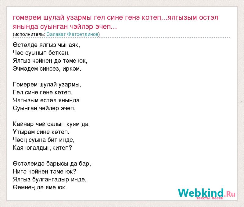 Главная→Исполнители→Салават Фатхетдинов→Гомерем шулай узармы гел сине генэ котеп...ялгызым остэл янында суынган чэйлэр э