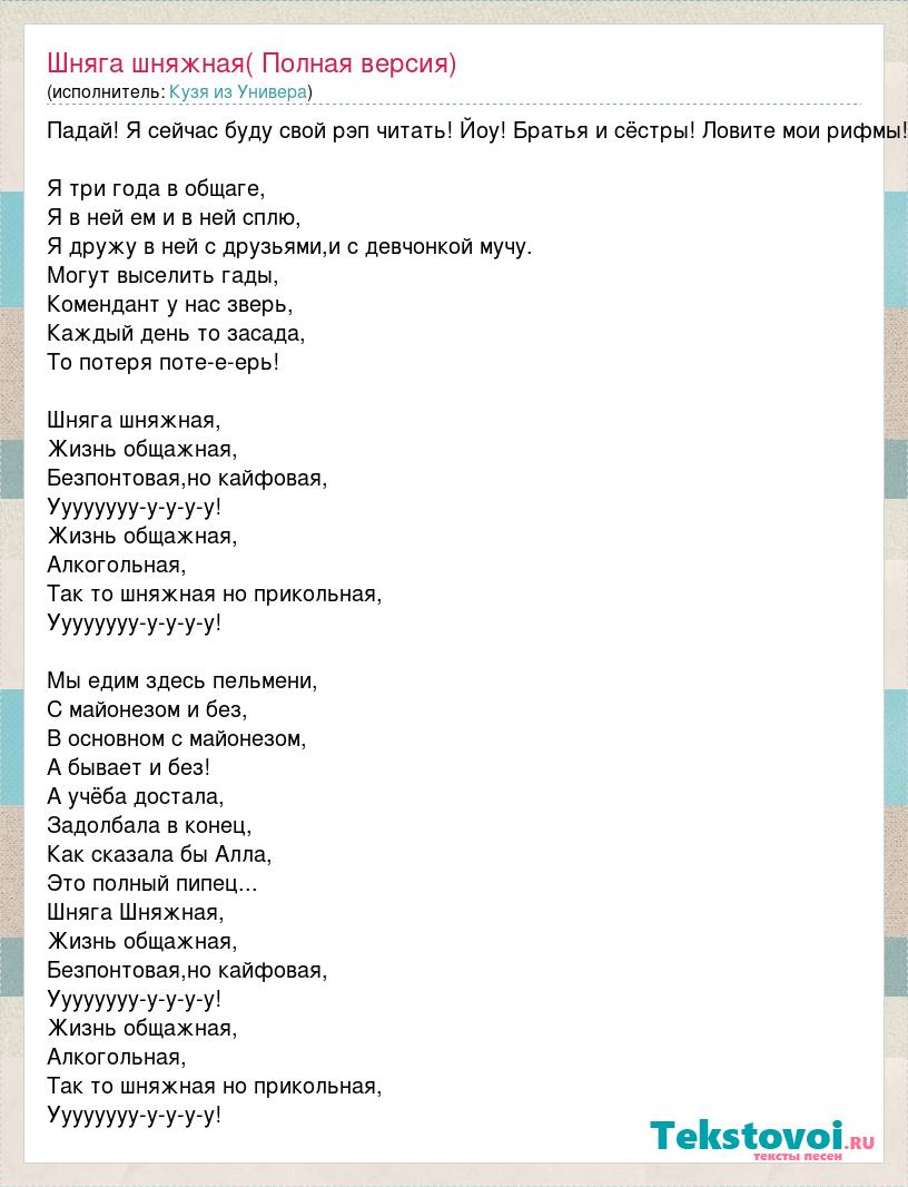 Падай! Я сейчас буду свой рэп читать! Йоу! Братья и сёстры! Ловите мои рифмы! Я три года в общаге, Я в ней ем и в ней сплю, Я дружу в ней с друзьями,и с девчонкой мучу. Могут выселить гады, Комендант у нас зверь, Каждый день то засада, То потеря поте-е-ерь! Шняга шняжная, Жизнь общажная, Безпонтовая,но кайфовая, Уууууууу-у-у-у-у! Жизнь общажная, Алкогольная, Так то шняжная но прикольная, Уууууууу-у-у-у-у! Мы едим здесь пельмени, С майонезом и без, В основном с майонезом, А бывает и без! А учёба достала, Задолбала в конец, Как сказала бы Алла, Это полный пипец... Шняга Шняжная, Жизнь общажная, Безпонтовая,но кайфовая, Уууууууу-у-у-у-у! Жизнь общажная, Алкогольная, Так то шняжная но прикольная, Уууууууу-у-у-у-у!