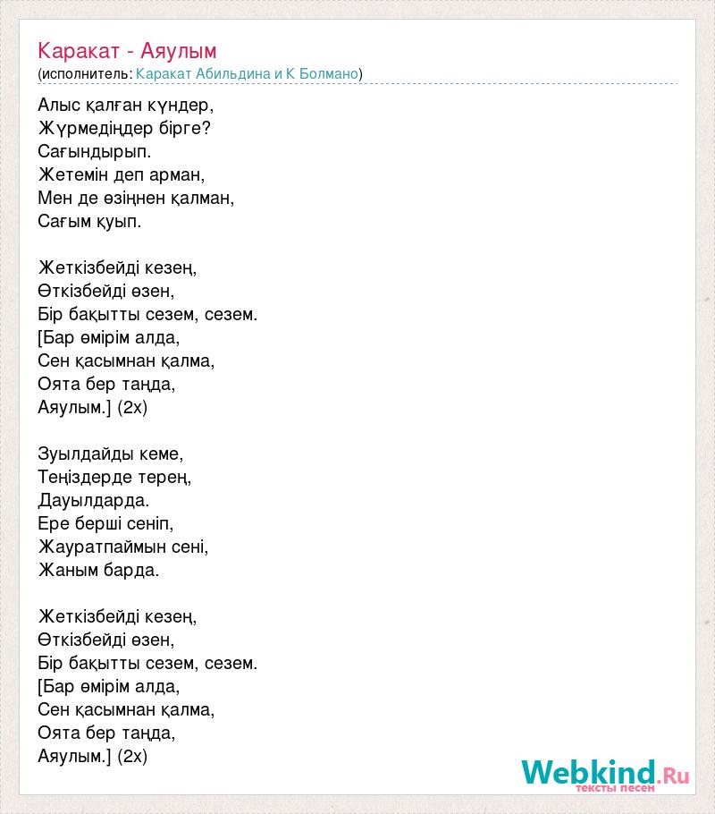 Алыс қалған күндер, Жүрмедіңдер бірге? Сағындырып. Жетемін деп арман, Мен де өзіңнен қалман, Сағым қуып. Жеткізбейді кезең, Өткізбейді өзен, Бір бақытты сезем, сезем. [Бар өмірім алда, Сен қасымнан қалма, Оята бер таңда, Аяулым.] (2х) Зуылдайды кеме, Теңіздерде терең, Дауылдарда. Ере берші сеніп, Жауратпаймын сені, Жаным барда. Жеткізбейді кезең, Өткізбейді өзен, Бір бақытты сезем, сезем. [Бар өмірім алда, Сен қасымнан қалма, Оята бер таңда, Аяулым.] (2х)