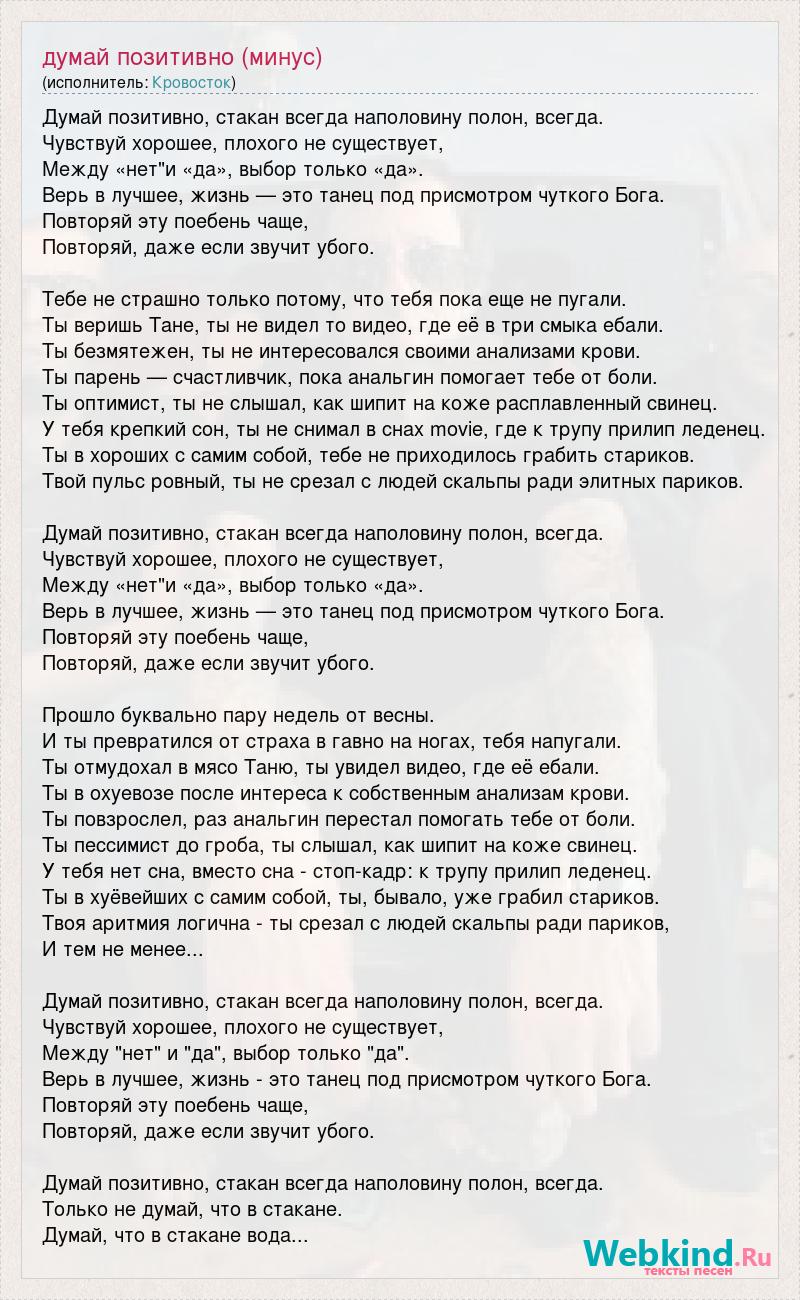 Думай позитивно, стакан всегда наполовину полон, всегда. Чувствуй хорошее, плохого не существует, Между «нет"и «да», выбор только «да». Верь в лучшее, жизнь — это танец под присмотром чуткого Бога. Повторяй эту поебень чаще, Повторяй, даже если звучит убого. Тебе не страшно только потому, что тебя пока еще не пугали. Ты веришь Тане, ты не видел то видео, где её в три смыка ебали. Ты безмятежен, ты не интересовался своими анализами крови. Ты парень — счастливчик, пока анальгин помогает тебе от боли. Ты оптимист, ты не слышал, как шипит на коже расплавленный свинец. У тебя крепкий сон, ты не снимал в снах movie, где к трупу прилип леденец. Ты в хороших с самим собой, тебе не приходилось грабить стариков. Твой пульс ровный, ты не срезал с людей скальпы ради элитных париков. Думай позитивно, стакан всегда наполовину полон, всегда. Чувствуй хорошее, плохого не существует, Между «нет"и «да», выбор только «да». Верь в лучшее, жизнь — это танец под присмотром чуткого Бога. Повторяй эту поебень чаще, Повторяй, даже если звучит убого. Прошло буквально пару недель от весны. И ты превратился от страха в гавно на ногах, тебя напугали. Ты отмудохал в мясо Таню, ты увидел видео, где её ебали. Ты в охуевозе после интереса к собственным анализам крови. Ты повзрослел, раз анальгин перестал помогать тебе от боли. Ты пессимист до гроба, ты слышал, как шипит на коже свинец. У тебя нет сна, вместо сна - стоп-кадр: к трупу прилип леденец. Ты в хуёвейших с самим собой, ты, бывало, уже грабил стариков. Твоя аритмия логична - ты срезал с людей скальпы ради париков, И тем не менее... Думай позитивно, стакан всегда наполовину полон, всегда. Чувствуй хорошее, плохого не существует, Между "нет" и "да", выбор только "да". Верь в лучшее, жизнь - это танец под присмотром чуткого Бога. Повторяй эту поебень чаще, Повторяй, даже если звучит убого. Думай позитивно, стакан всегда наполовину полон, всегда. Только не думай, что в стакане. Думай, что в стакане вода...