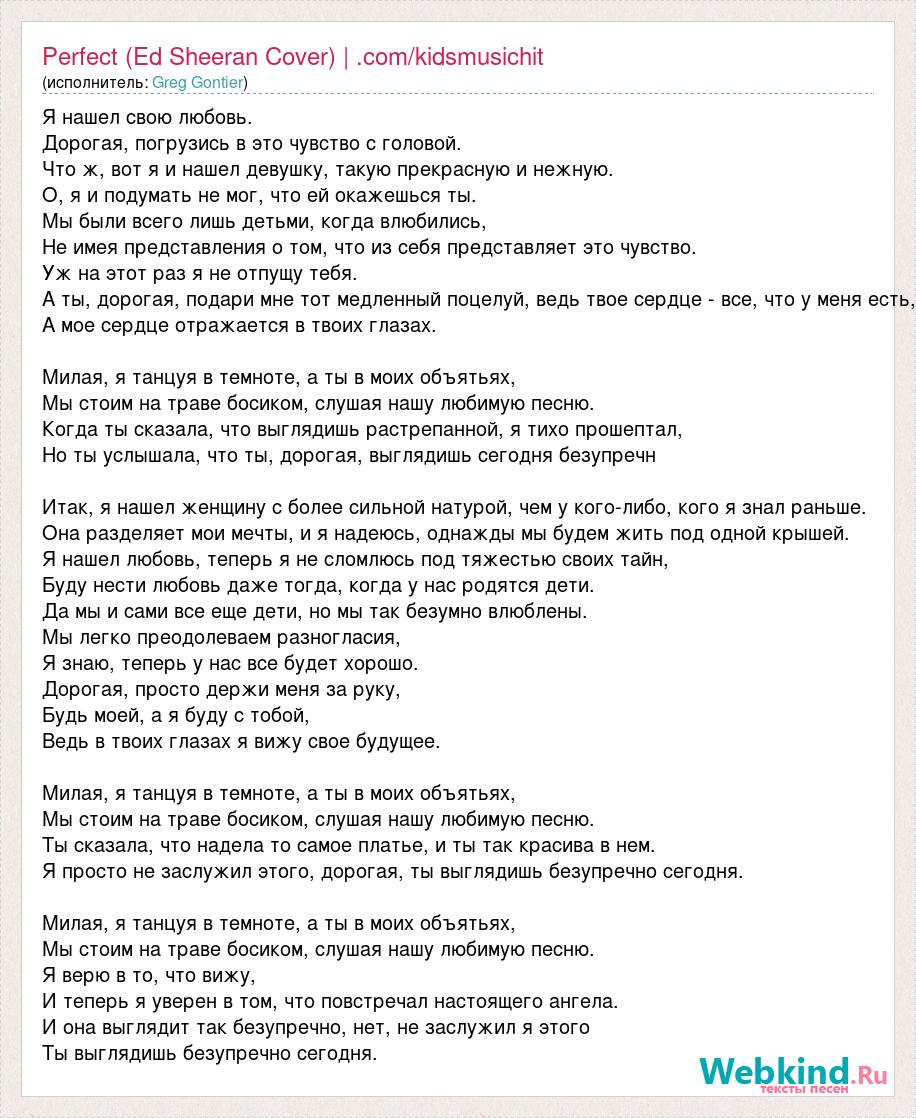 Я нашел свою любовь. Дорогая, погрузись в это чувство с головой. Что ж, вот я и нашел девушку, такую прекрасную и нежную. О, я и подумать не мог, что ей окажешься ты. Мы были всего лишь детьми, когда влюбились, Не имея представления о том, что из себя представляет это чувство. Уж на этот раз я не отпущу тебя. А ты, дорогая, подари мне тот медленный поцелуй, ведь твое сердце - все, что у меня есть, А мое сердце отражается в твоих глазах. Милая, я танцуя в темноте, а ты в моих объятьях, Мы стоим на траве босиком, слушая нашу любимую песню. Когда ты сказала, что выглядишь растрепанной, я тихо прошептал, Но ты услышала, что ты, дорогая, выглядишь сегодня безупречн Итак, я нашел женщину с более сильной натурой, чем у кого-либо, кого я знал раньше. Она разделяет мои мечты, и я надеюсь, однажды мы будем жить под одной крышей. Я нашел любовь, теперь я не сломлюсь под тяжестью своих тайн, Буду нести любовь даже тогда, когда у нас родятся дети. Да мы и сами все еще дети, но мы так безумно влюблены. Мы легко преодолеваем разногласия, Я знаю, теперь у нас все будет хорошо. Дорогая, просто держи меня за руку, Будь моей, а я буду с тобой, Ведь в твоих глазах я вижу свое будущее. Милая, я танцуя в темноте, а ты в моих объятьях, Мы стоим на траве босиком, слушая нашу любимую песню. Ты сказала, что надела то самое платье, и ты так красива в нем. Я просто не заслужил этого, дорогая, ты выглядишь безупречно сегодня. Милая, я танцуя в темноте, а ты в моих объятьях, Мы стоим на траве босиком, слушая нашу любимую песню. Я верю в то, что вижу, И теперь я уверен в том, что повстречал настоящего ангела. И она выглядит так безупречно, нет, не заслужил я этого Ты выглядишь безупречно сегодня.
