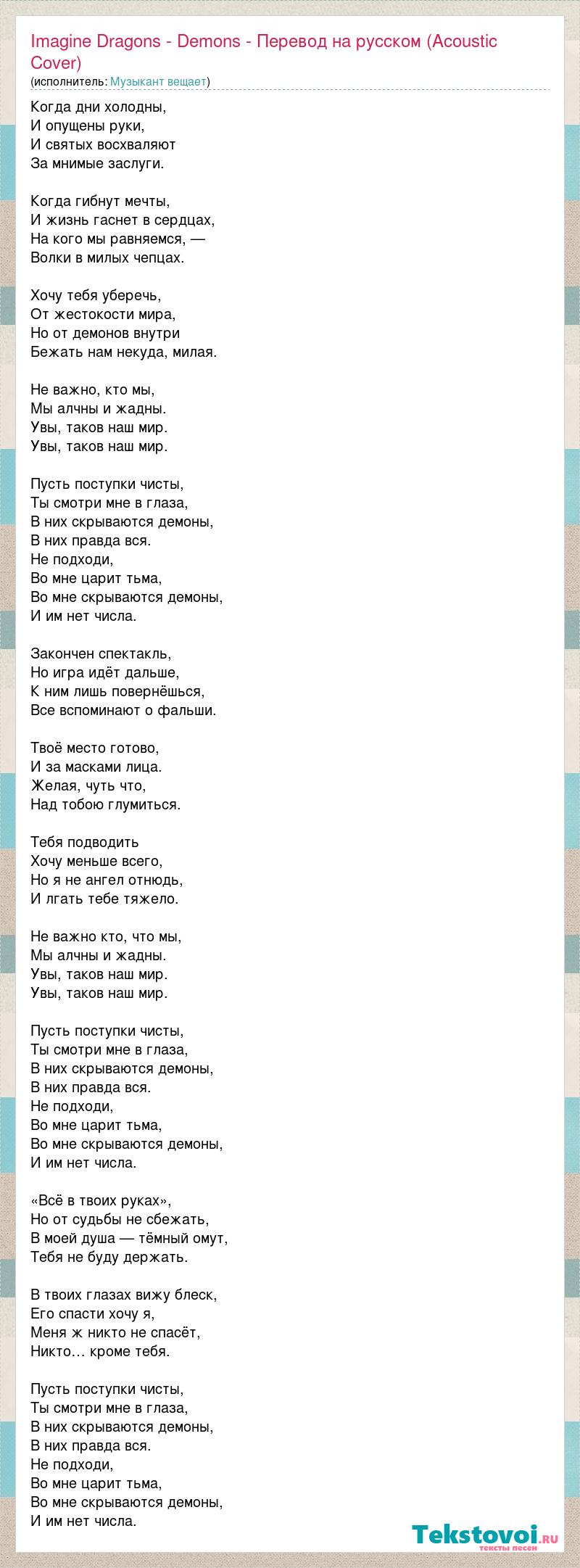 Когда дни холодны, И опущены руки, И святых восхваляют За мнимые заслуги. Когда гибнут мечты, И жизнь гаснет в сердцах, На кого мы равняемся, — Волки в милых чепцах. Хочу тебя уберечь, От жестокости мира, Но от демонов внутри Бежать нам некуда, милая. Не важно, кто мы, Мы алчны и жадны. Увы, таков наш мир. Увы, таков наш мир. Пусть поступки чисты, Ты смотри мне в глаза, В них скрываются демоны, В них правда вся. Не подходи, Во мне царит тьма, Во мне скрываются демоны, И им нет числа. Закончен спектакль, Но игра идёт дальше, К ним лишь повернёшься, Все вспоминают о фальши. Твоё место готово, И за масками лица. Желая, чуть что, Над тобою глумиться. Тебя подводить Хочу меньше всего, Но я не ангел отнюдь, И лгать тебе тяжело. Не важно кто, что мы, Мы алчны и жадны. Увы, таков наш мир. Увы, таков наш мир. Пусть поступки чисты, Ты смотри мне в глаза, В них скрываются демоны, В них правда вся. Не подходи, Во мне царит тьма, Во мне скрываются демоны, И им нет числа. «Всё в твоих руках», Но от судьбы не сбежать, В моей душа — тёмный омут, Тебя не буду держать. В твоих глазах вижу блеск, Его спасти хочу я, Меня ж никто не спасёт, Никто… кроме тебя. Пусть поступки чисты, Ты смотри мне в глаза, В них скрываются демоны, В них правда вся. Не подходи, Во мне царит тьма, Во мне скрываются демоны, И им нет числа.