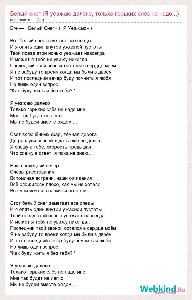 Dre — «Белый Снег» («Я Уезжаю» ) Вот белый снег заметает все следы И я опять один внутри ужасной пустоты Твой поезд этой ночью уезжает навсегда И может я тебя не увижу никогда.. . Последний твой звонок остался в сердце моём Я не забуду то время когда мы были в двоём И тот последний вечер буду помнить я любя Но лишь один вопрос: "Как буду жить я без тебя? " Я уезжаю далеко Только горьких слёз не надо мне Мне так будет не легко Мы не будем вместе рядом.. . Свет включённых фар, тёмная дорога До разлуки вечной ждать ещё не долго Я спешу к тебе, скорость превышая Что скажу в ответ, я пока не знаю.. . Наш последний вечер Слёзы расстования Вспоминая встречи, наши ожидания Всё сложилось плохо, как мы не хотели Все мои мечты в пламяни сгорели.. . Этот белый снег заметает все следы И я опять один внутри ужасной пустоты Твой поезд этой ночью уезжает навсегда И может я тебя не увижу никогда.. . Последний твой звонок остался в сердце моём Я не забуду то время когда мы были в двоём И тот последний вечер буду помнить я любя Но лишь один вопрос: "Как буду жить я без тебя? " Я уезжаю далеко Только горьких слёз не надо мне Мне так будет не легко Мы не будем вместе рядом.. .