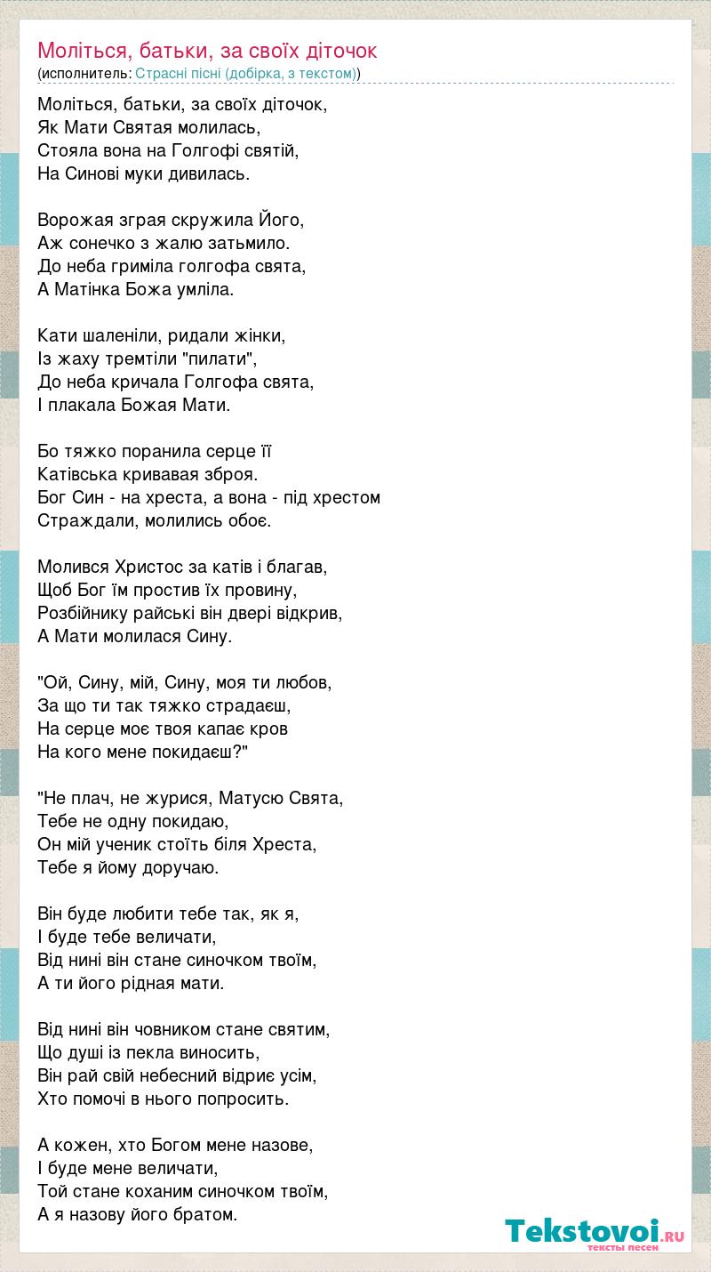 Моліться, батьки, за своїх діточок, Як Мати Святая молилась, Стояла вона на Голгофі святій, На Синові муки дивилась. Ворожая зграя скружила Його, Аж сонечко з жалю затьмило. До неба гриміла голгофа свята, А Матінка Божа умліла. Кати шаленіли, ридали жінки, Із жаху тремтіли "пилати", До неба кричала Голгофа свята, І плакала Божая Мати. Бо тяжко поранила серце її Катівська кривавая зброя. Бог Син - на хреста, а вона - під хрестом Страждали, молились обоє. Молився Христос за катів і благав, Щоб Бог їм простив їх провину, Розбійнику райські він двері відкрив, А Мати молилася Сину. "Ой, Сину, мій, Сину, моя ти любов, За що ти так тяжко страдаєш, На серце моє твоя капає кров На кого мене покидаєш?" "Не плач, не журися, Матусю Свята, Тебе не одну покидаю, Он мій ученик стоїть біля Хреста, Тебе я йому доручаю. Він буде любити тебе так, як я, І буде тебе величати, Від нині він стане синочком твоїм, А ти його рідная мати. Від нині він човником стане святим, Що душі із пекла виносить, Він рай свій небесний відриє усім, Хто помочі в нього попросить. А кожен, хто Богом мене назове, І буде мене величати, Той стане коханим синочком твоїм, А я назову його братом.