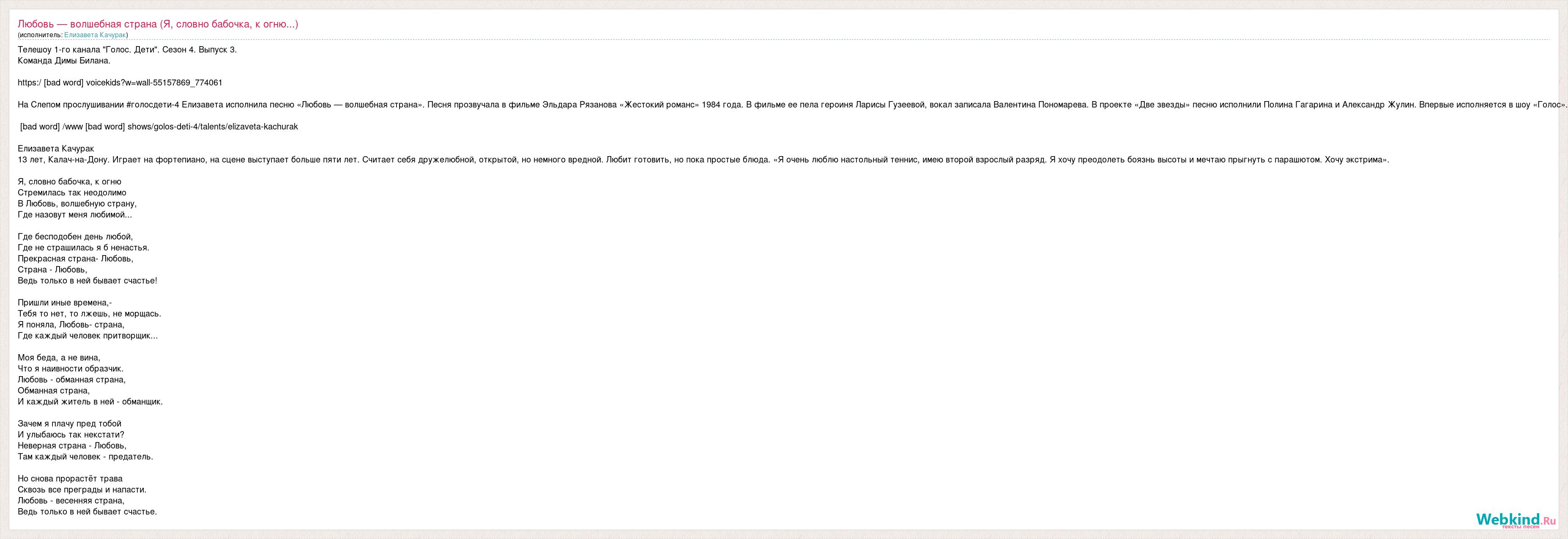 Телешоу 1-го канала "Голос. Дети". Сезон 4. Выпуск 3. Команда Димы Билана. https:/ [bad word] voicekids?w=wall-55157869_774061 На Слепом прослушивании #голосдети-4 Елизавета исполнила песню «Любовь — волшебная страна». Песня прозвучала в фильме Эльдара Рязанова «Жестокий романс» 1984 года. В фильме ее пела героиня Ларисы Гузеевой, вокал записала Валентина Пономарева. В проекте «Две звезды» песню исполнили Полина Гагарина и Александр Жулин. Впервые исполняется в шоу «Голос». [bad word] /www [bad word] shows/golos-deti-4/talents/elizaveta-kachurak Елизавета Качурак 13 лет, Калач-на-Дону. Играет на фортепиано, на сцене выступает больше пяти лет. Считает себя дружелюбной, открытой, но немного вредной. Любит готовить, но пока простые блюда. «Я очень люблю настольный теннис, имею второй взрослый разряд. Я хочу преодолеть боязнь высоты и мечтаю прыгнуть с парашютом. Хочу экстрима». Я, словно бабочка, к огню Стремилась так неодолимо В Любовь, волшебную страну, Где назовут меня любимой... Где бесподобен день любой, Где не страшилась я б ненастья. Прекрасная страна- Любовь, Страна - Любовь, Ведь только в ней бывает счастье! Пришли иные времена,- Тебя то нет, то лжешь, не морщась. Я поняла, Любовь- страна, Где каждый человек притворщик... Моя беда, а не вина, Что я наивности образчик. Любовь - обманная страна, Обманная страна, И каждый житель в ней - обманщик. Зачем я плачу пред тобой И улыбаюсь так некстати? Неверная страна - Любовь, Там каждый человек - предатель. Но снова прорастёт трава Сквозь все преграды и напасти. Любовь - весенняя страна, Ведь только в ней бывает счастье.