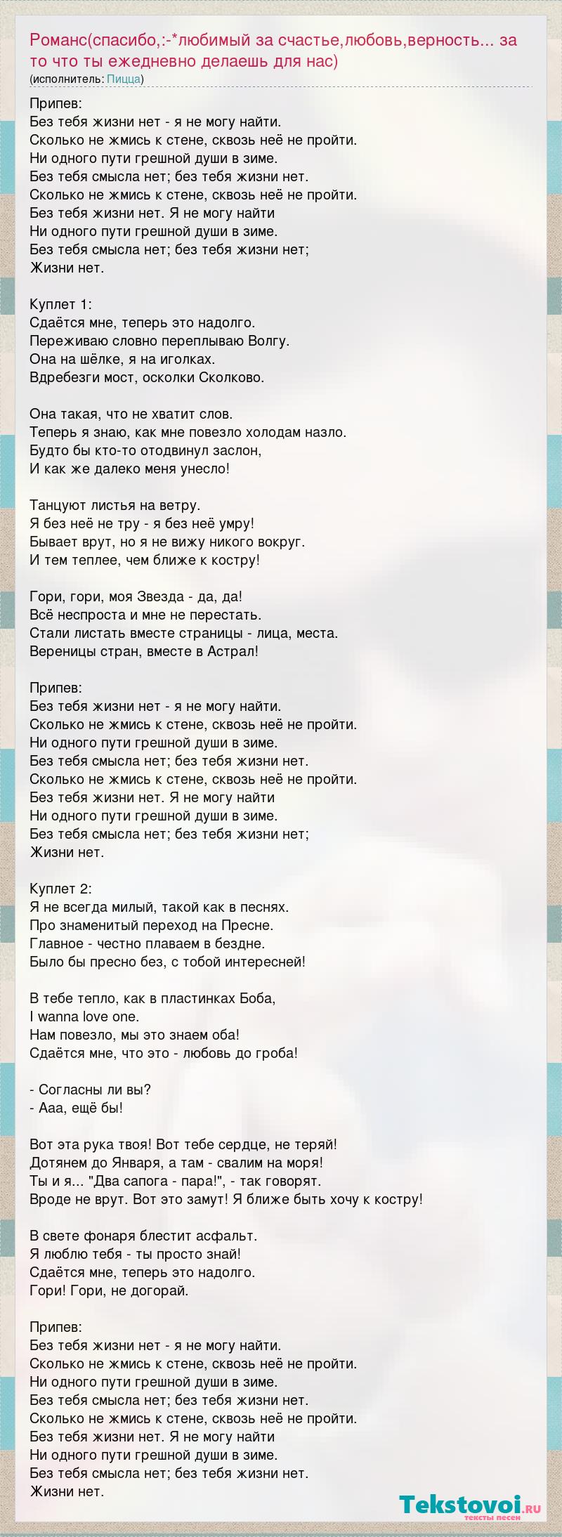 Припев: Без тебя жизни нет - я не могу найти. Сколько не жмись к стене, сквозь неё не пройти. Ни одного пути грешной души в зиме. Без тебя смысла нет; без тебя жизни нет. Сколько не жмись к стене, сквозь неё не пройти. Без тебя жизни нет. Я не могу найти Ни одного пути грешной души в зиме. Без тебя смысла нет; без тебя жизни нет; Жизни нет. Куплет 1: Сдаётся мне, теперь это надолго. Переживаю словно переплываю Волгу. Она на шёлке, я на иголках. Вдребезги мост, осколки Сколково. Она такая, что не хватит слов. Теперь я знаю, как мне повезло холодам назло. Будто бы кто-то отодвинул заслон, И как же далеко меня унесло! Танцуют листья на ветру. Я без неё не тру - я без неё умру! Бывает врут, но я не вижу никого вокруг. И тем теплее, чем ближе к костру! Гори, гори, моя Звезда - да, да! Всё неспроста и мне не перестать. Стали листать вместе страницы - лица, места. Вереницы стран, вместе в Астрал! Припев: Без тебя жизни нет - я не могу найти. Сколько не жмись к стене, сквозь неё не пройти. Ни одного пути грешной души в зиме. Без тебя смысла нет; без тебя жизни нет. Сколько не жмись к стене, сквозь неё не пройти. Без тебя жизни нет. Я не могу найти Ни одного пути грешной души в зиме. Без тебя смысла нет; без тебя жизни нет; Жизни нет. Куплет 2: Я не всегда милый, такой как в песнях. Про знаменитый переход на Пресне. Главное - честно плаваем в бездне. Было бы пресно без, с тобой интересней! В тебе тепло, как в пластинках Боба, I wanna love one. Нам повезло, мы это знаем оба! Сдаётся мне, что это - любовь до гроба! - Согласны ли вы? - Ааа, ещё бы! Вот эта рука твоя! Вот тебе сердце, не теряй! Дотянем до Января, а там - свалим на моря! Ты и я... "Два сапога - пара!", - так говорят. Вроде не врут. Вот это замут! Я ближе быть хочу к костру! В свете фонаря блестит асфальт. Я люблю тебя - ты просто знай! Сдаётся мне, теперь это надолго. Гори! Гори, не догорай. Припев: Без тебя жизни нет - я не могу найти. Сколько не жмись к стене, сквозь неё не пройти. Ни одного пути грешной души в зиме. Без тебя смысла нет; без тебя жизни нет. Сколько не жмись к стене, сквозь неё не пройти. Без тебя жизни нет. Я не могу найти Ни одного пути грешной души в зиме. Без тебя смысла нет; без тебя жизни нет. Жизни нет.