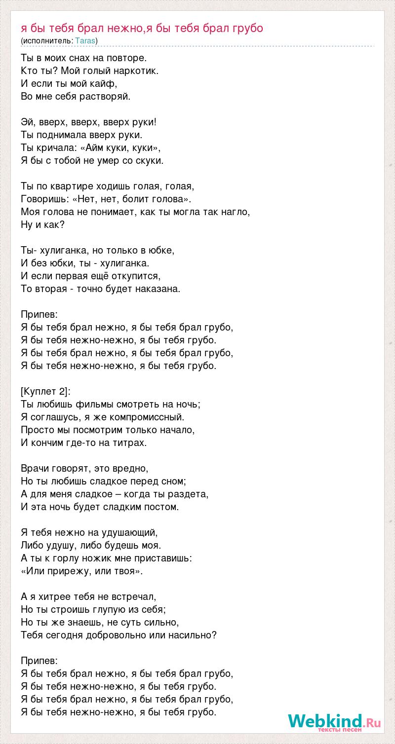Ты в моих снах на повторе. Кто ты? Мой голый наркотик. И если ты мой кайф, Во мне себя растворяй. Эй, вверх, вверх, вверх руки! Ты поднимала вверх руки. Ты кричала: «Айм куки, куки», Я бы с тобой не умер со скуки. Ты по квартире ходишь голая, голая, Говоришь: «Нет, нет, болит голова». Моя голова не понимает, как ты могла так нагло, Ну и как? Ты- хулиганка, но только в юбке, И без юбки, ты - хулиганка. И если первая ещё откупится, То вторая - точно будет наказана. Припев: Я бы тебя брал нежно, я бы тебя брал грубо, Я бы тебя нежно-нежно, я бы тебя грубо. Я бы тебя брал нежно, я бы тебя брал грубо, Я бы тебя нежно-нежно, я бы тебя грубо. [Куплет 2]: Ты любишь фильмы смотреть на ночь; Я соглашусь, я же компромиссный. Просто мы посмотрим только начало, И кончим где-то на титрах. Врачи говорят, это вредно, Но ты любишь сладкое перед сном; А для меня сладкое – когда ты раздета, И эта ночь будет сладким постом. Я тебя нежно на удушающий, Либо удушу, либо будешь моя. А ты к горлу ножик мне приставишь: «Или прирежу, или твоя». А я хитрее тебя не встречал, Но ты строишь глупую из себя; Но ты же знаешь, не суть сильно, Тебя сегодня добровольно или насильно? Припев: Я бы тебя брал нежно, я бы тебя брал грубо, Я бы тебя нежно-нежно, я бы тебя грубо. Я бы тебя брал нежно, я бы тебя брал грубо, Я бы тебя нежно-нежно, я бы тебя грубо.