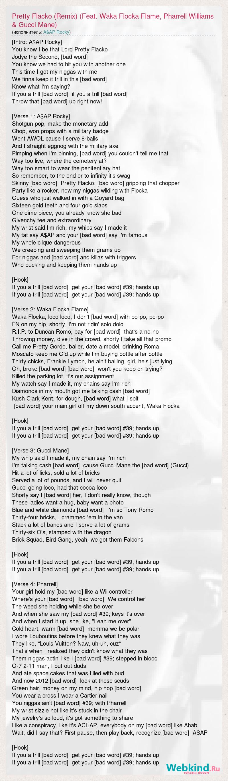 [Intro: A$AP Rocky] You know I be that Lord Pretty Flacko Jodye the Second, [bad word] You know we had to hit you with another one This time I got my niggas with me We finna keep it trill in this [bad word] Know what I'm saying? If you a trill [bad word] if you a trill [bad word] Throw that [bad word] up right now! [Verse 1: A$AP Rocky] Shotgun pop, make the monetary add Chop, won props with a military badge Went AWOL cause I serve 8-balls And I straight eggnog with the military axe Pimping when I'm pinning, [bad word] you couldn't tell me that Way too live, where the cemetery at? Way too smart to wear the penitentiary hat So remember, to the end or to infinity it's swag Skinny [bad word] Pretty Flacko, [bad word] gripping that chopper Party like a rocker, now my niggas wilding with Flocka Guess who just walked in with a Goyard bag Sixteen gold teeth and four gold slabs One dime piece, you already know she bad Givenchy tee and extraordinary My wrist said I'm rich, my whips say I made it My tat say A$AP and your [bad word] say I'm famous My whole clique dangerous We creeping and sweeping them grams up For niggas and [bad word] and killas with triggers Who bucking and keeping them hands up [Hook] If you a trill [bad word] get your [bad word] #39; hands up If you a trill [bad word] get your [bad word] #39; hands up [Verse 2: Waka Flocka Flame] Waka Flocka, loco loco, I don't [bad word] with po-po, po-po FN on my hip, shorty, I'm not ridin' solo dolo R.I.P. to Duncan Romo, pay for [bad word] that's a no-no Throwing money, dive in the crowd, shorty I take all that promo Call me Pretty Gordo, baller, date a model, drinking Roma Moscato keep me G'd up while I'm buying bottle after bottle Thirty chicks, Frankie Lymon, he ain't balling, girl, he's just lying Oh, broke [bad word] [bad word] won't you keep on trying? Killed the parking lot, it's our assignment My watch say I made it, my chains say I'm rich Diamonds in my mouth got me talking cash [bad word] Kush Clark Kent, for dough, [bad word] what I spit [bad word] your main girl off my down south accent, Waka Flocka [Hook] If you a trill [bad word] get your [bad word] #39; hands up If you a trill [bad word] get your [bad word] #39; hands up [Verse 3: Gucci Mane] My whip said I made it, my chain say I'm rich I'm talking cash [bad word] cause Gucci Mane the [bad word] (Gucci) Hit a lot of licks, sold a lot of bricks Served a lot of pounds, and I will never quit Gucci going loco, had that cocoa loco Shorty say I [bad word] her, I don't really know, though These ladies want a hug, baby want a photo Blue and white diamonds [bad word] I'm so Tony Romo Thirty-four bricks, I crammed 'em in the van Stack a lot of bands and I serve a lot of grams Thirty-six O's, stamped with the dragon Brick Squad, Bird Gang, yeah, we got them Falcons [Hook] If you a trill [bad word] get your [bad word] #39; hands up If you a trill [bad word] get your [bad word] #39; hands up [Verse 4: Pharrell] Your girl hold my [bad word] like a Wii controller Where's your [bad word] [bad word] We control her The weed she holding while she be over And when she saw my [bad word] #39; keys it's over And when I start it up, she like, "Lean me over" Cold heart, warm [bad word] momma we be polar I wore Louboutins before they knew what they was They like, "Louis Vuitton? Naw, uh-uh, cuz" That's when I realized they didn't know what they was Them niggas actin' like I [bad word] #39; stepped in blood O-7 2-11 man, I put out duds And ate space cakes that was filled with bud And now 2012 [bad word] look at these scuds Green hair, money on my mind, hip hop [bad word] You wear a cross I wear a Cartier nail You niggas ain't [bad word] #39; with Pharrell My wrist sizzle hot like it's stuck in the chair My jewelry's so loud, it's got something to share Like a conspiracy, like it's ACHAP, everybody on my [bad word] like Ahab Wait, did I say that? First pause, then play back, recognize [bad word] ASAP [Hook] If you a trill [bad word] get your [bad word] #39; hands up If you a trill [bad word] get your [bad word] #39; hands up