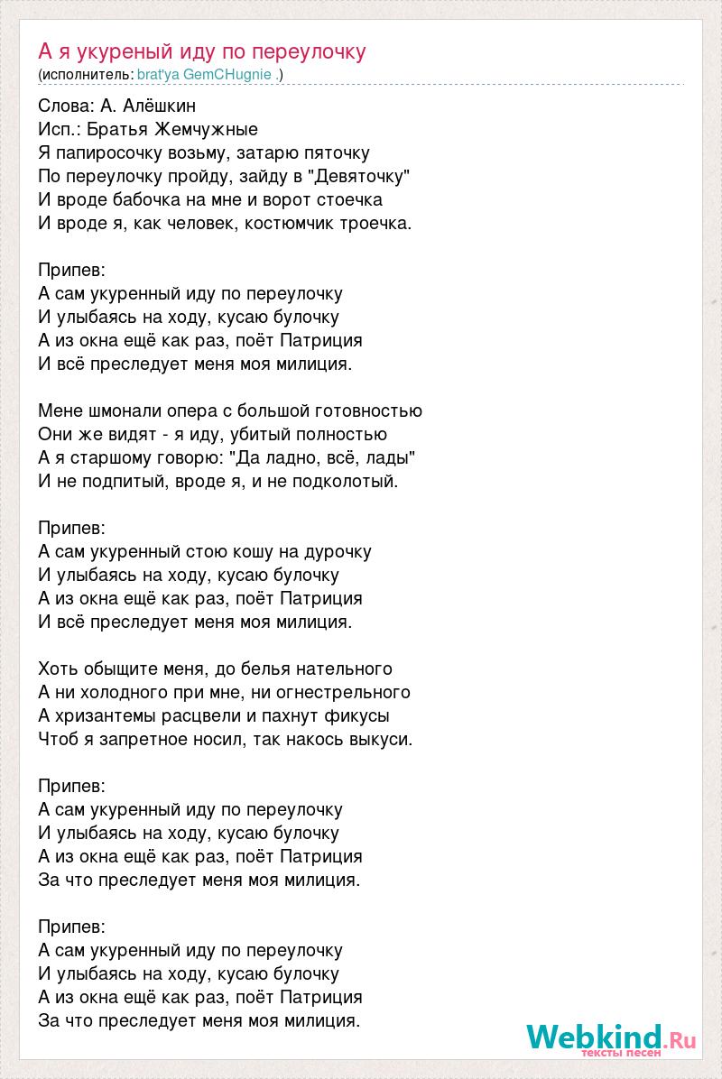 Слова: А. Алёшкин Исп.: Братья Жемчужные Я папиросочку возьму, затарю пяточку По переулочку пройду, зайду в "Девяточку" И вроде бабочка на мне и ворот стоечка И вроде я, как человек, костюмчик троечка. Припев: А сам укуренный иду по переулочку И улыбаясь на ходу, кусаю булочку А из окна ещё как раз, поёт Патриция И всё преследует меня моя милиция. Мене шмонали опера с большой готовностью Они же видят - я иду, убитый полностью А я старшому говорю: "Да ладно, всё, лады" И не подпитый, вроде я, и не подколотый. Припев: А сам укуренный стою кошу на дурочку И улыбаясь на ходу, кусаю булочку А из окна ещё как раз, поёт Патриция И всё преследует меня моя милиция. Хоть обыщите меня, до белья нательного А ни холодного при мне, ни огнестрельного А хризантемы расцвели и пахнут фикусы Чтоб я запретное носил, так накось выкуси. Припев: А сам укуренный иду по переулочку И улыбаясь на ходу, кусаю булочку А из окна ещё как раз, поёт Патриция За что преследует меня моя милиция. Припев: А сам укуренный иду по переулочку И улыбаясь на ходу, кусаю булочку А из окна ещё как раз, поёт Патриция За что преследует меня моя милиция.