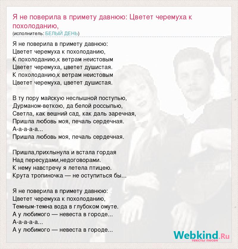 Я не поверила в примету давнюю: Цветет черемуха к похолоданию, К похолоданию,к ветрам неистовым Цветет черемуха, цветет душистая. К похолоданию,к ветрам неистовым Цветет черемуха, цветет душистая. В ту пору майскую неслышной поступью, Дурманом-веткою, да белой россыпью, Светла, как вешний сад, как даль заречная, Пришла любовь моя, печаль сердечная. А-а-а-а-а... Пришла любовь моя, печаль сердечная. Пришла,прихлынула и встала гордая Над пересудами,недоговорами. К нему навстречу я летела птицею. Крута тропиночка — не оступиться бы... Я не поверила в примету давнюю: Цветет черемуха к похолоданию, Темным-темна вода в глубоком омуте. А у любимого — невеста в городе... А-а-а-а-а... А у любимого — невеста в городе...