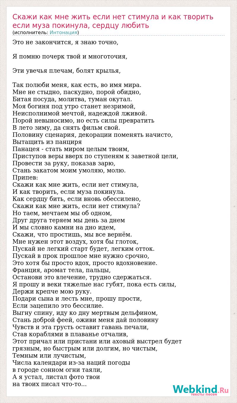 Главная→Исполнители→Интонация→Скажи как мне жить если нет стимула и как творить если муза покинула, серд