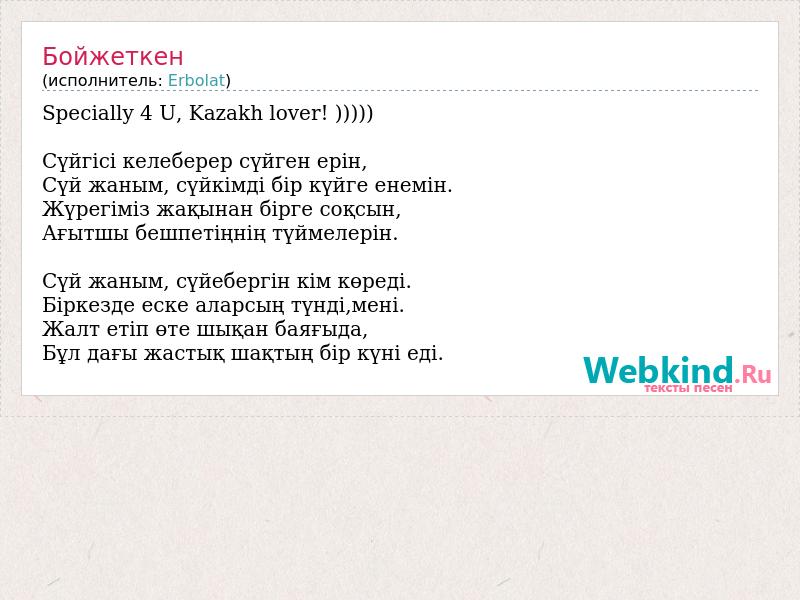 Specially 4 U, Kazakh lover! ))))) Сүйгісі келеберер сүйген ерін, Сүй жаным, сүйкімді бір күйге енемін. Жүрегіміз жақынан бірге соқсын, Ағытшы бешпетіңнің түймелерін. Сүй жаным, сүйебергін кім көреді. Біркезде еске аларсың түнді,мені. Жалт етіп өте шықан баяғыда, Бұл дағы жастық шақтың бір күні еді.