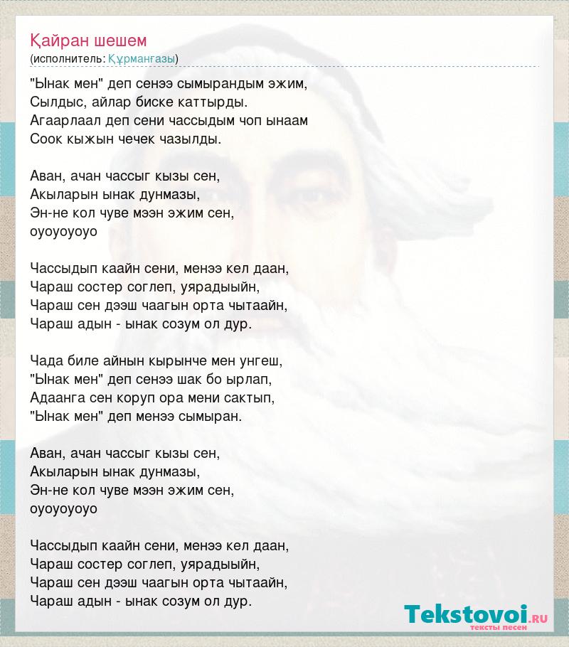 "Ынак мен" деп сенээ сымырандым эжим, Сылдыс, айлар биске каттырды. Агаарлаал деп сени чассыдым чоп ынаам Соок кыжын чечек чазылды. Аван, ачан чассыг кызы сен, Акыларын ынак дунмазы, Эн-не кол чуве мээн эжим сен, оуоуоуоуо Чассыдып каайн сени, менээ кел даан, Чараш состер соглеп, уярадыыйн, Чараш сен дээш чаагын орта чытаайн, Чараш адын - ынак созум ол дур. Чада биле айнын кырынче мен унгеш, "Ынак мен" деп сенээ шак бо ырлап, Адаанга сен коруп ора мени сактып, "Ынак мен" деп менээ сымыран. Аван, ачан чассыг кызы сен, Акыларын ынак дунмазы, Эн-не кол чуве мээн эжим сен, оуоуоуоуо Чассыдып каайн сени, менээ кел даан, Чараш состер соглеп, уярадыыйн, Чараш сен дээш чаагын орта чытаайн, Чараш адын - ынак созум ол дур.