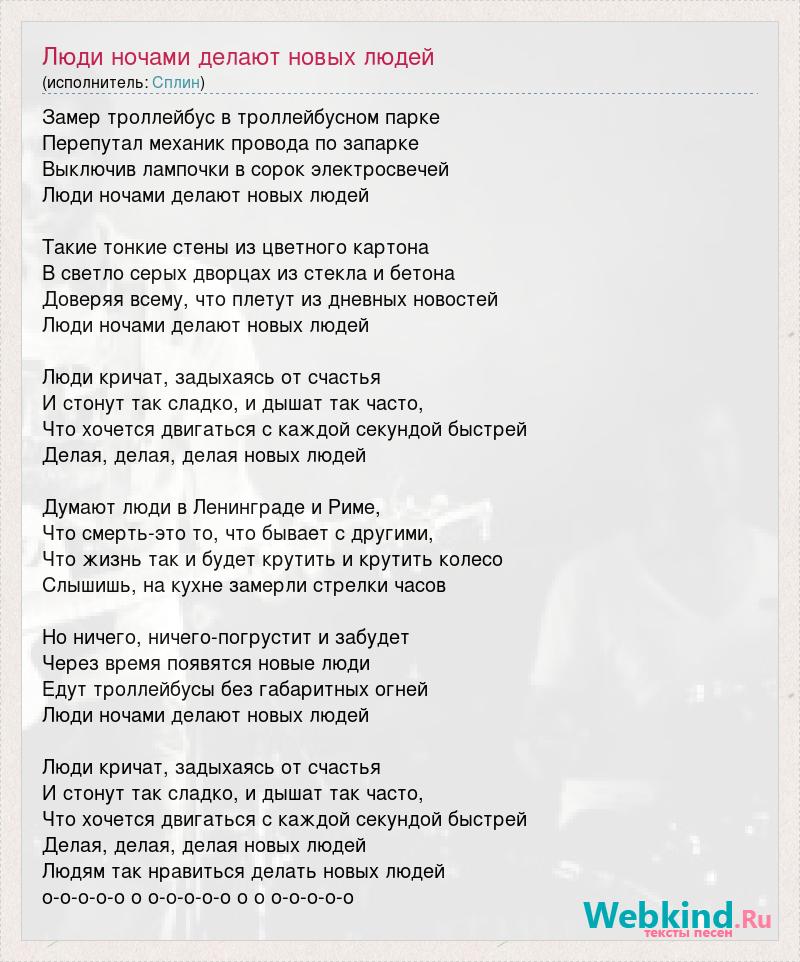 Замер троллейбус в троллейбусном парке Перепутал механик провода по запарке Выключив лампочки в сорок электросвечей Люди ночами делают новых людей Такие тонкие стены из цветного картона В светло серых дворцах из стекла и бетона Доверяя всему, что плетут из дневных новостей Люди ночами делают новых людей Люди кричат, задыхаясь от счастья И стонут так сладко, и дышат так часто, Что хочется двигаться с каждой секундой быстрей Делая, делая, делая новых людей Думают люди в Ленинграде и Риме, Что смерть-это то, что бывает с другими, Что жизнь так и будет крутить и крутить колесо Слышишь, на кухне замерли стрелки часов Но ничего, ничего-погрустит и забудет Через время появятся новые люди Едут троллейбусы без габаритных огней Люди ночами делают новых людей Люди кричат, задыхаясь от счастья И стонут так сладко, и дышат так часто, Что хочется двигаться с каждой секундой быстрей Делая, делая, делая новых людей Людям так нравиться делать новых людей о-о-о-о-о о о-о-о-о-о о о о-о-о-о-о