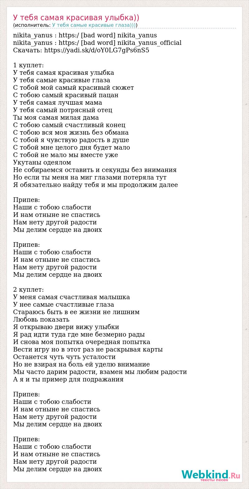 nikita_yanus : https:/ [bad word] nikita_yanus nikita_yanus : https:/ [bad word] nikita_yanus_official Скачать: https://yadi.sk/d/oY0LG7gPs6nS5 1 куплет: У тебя самая красивая улыбка У тебя самые красивые глаза С тобой мой самый красивый сюжет С тобою самый красивый пацан У тебя самая лучшая мама У тебя самый потрясный отец Ты моя самая милая дама С тобою самый счастливый конец С тобою вся моя жизнь без обмана С тобой я чувствую радость в душе С тобой мне целого дня будет мало С тобой не мало мы вместе уже Укутаны одеялом Не собираемся оставить и секунды без внимания Но если ты меня на миг глазами потеряла тут Я обязательно найду тебя и мы продолжим далее Припев: Наши с тобою слабости И нам отныне не спастись Нам нету другой радости Мы делим сердце на двоих Припев: Наши с тобою слабости И нам отныне не спастись Нам нету другой радости Мы делим сердце на двоих 2 куплет: У меня самая счастливая малышка У нее самые счастливые глаза Стараюсь быть в ее жизни не лишним Любовь показать Я открываю двери вижу улыбки Я рад идти туда где мне безмерно рады И снова моя попытка очередная попытка Вести игру но в этот раз не раскрывая карты Останется чуть чуть усталости Но не взирая на боль ей уделю внимание Мы часто дарим радости, взамен мы любим радости А я и ты пример для подражания Припев: Наши с тобою слабости И нам отныне не спастись Нам нету другой радости Мы делим сердце на двоих Припев: Наши с тобою слабости И нам отныне не спастись Нам нету другой радости Мы делим сердце на двоих