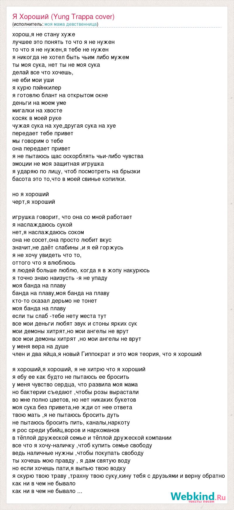 хорош,я не стану хуже лучшее это понять то что я не нужен то что я не нужен,я тебе не нужен я никогда не хотел быть чьим либо мужем ты моя сука, нет ты не моя сука делай все что хочешь, не еби мои уши я курю пэйнкилер я готовлю блант на открытом окне деньги на моем уме мигалки на хвосте косяк в моей руке чужая сука на хуе,другая сука на хуе передает тебе привет мы говорим о тебе она передает привет я не пытаюсь щас оскорблять чьи-либо чувства эмоции не моя защитная игрушка я ударяю по лицу, чтоб посмотреть на брызки басота это то,что в моей свинье копилки. но я хороший черт,я хороший игрушка говорит, что она со мной работает я наслаждаюсь сукой нет,я наслаждаюсь соком она не сосет,она просто любит вкус значит,не даёт слабины ,и я ей горжусь я не хочу увидеть что то, оттого что я влюблюсь я людей больше люблю, когда я в жопу накурюсь я точно знаю наизусть -я не упаду моя банда на плаву банда на плаву,моя банда на плаву кто-то сказал дерьмо не тонет моя банда на плаву если ты слаб -тебе нету места тут все мои деньги любят звук и стоны ярких сук мои демоны хитрят,но мои ангелы не врут все мои демоны хитрят ,но мои ангелы не врут у меня вера на душе член и два яйца,я новый Гиппократ и это моя теория, что я хороший я хороший,я хороший, я не хитрю что я хороший я ебу ее как будто не пытаюсь ее бросить у меня чувство сердца, что развила моя мама но бактерии съедают ,чтобы розы вырастали во мне полно цветов, но нет никаких букетов моя сука без привета,не жди от нее ответа твою мать ,я не пытаюсь бросить дуть не пытаюсь бросить пить, каналы,наркоту я рос среди убийц,воров и наркоманов в тёплой дружеской семье и тёплой дружеской компании все что я хочу-наличку ,чтоб купить семье свободу ведь наличные нужны ,чтобы покупать свободу ты хочешь мою правду , я дам святую воду но если хочешь пати,я выпью твою водку я скурю твою траву ,трахну твою суку,кину тебя с друзьями и верну обратно как ни в чем не бывало как ни в чем не бывало ...
