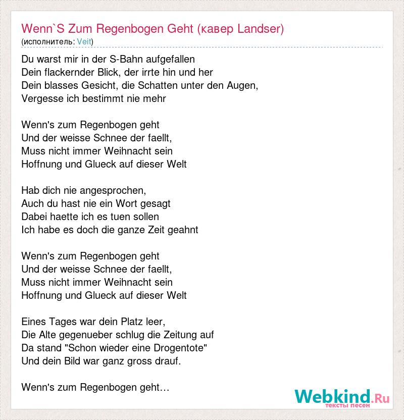 Du warst mir in der S-Bahn aufgefallen Dein flackernder Blick, der irrte hin und her Dein blasses Gesicht, die Schatten unter den Augen, Vergesse ich bestimmt nie mehr Wenn's zum Regenbogen geht Und der weisse Schnee der faellt, Muss nicht immer Weihnacht sein Hoffnung und Glueck auf dieser Welt Hab dich nie angesprochen, Auch du hast nie ein Wort gesagt Dabei haette ich es tuen sollen Ich habe es doch die ganze Zeit geahnt Wenn's zum Regenbogen geht Und der weisse Schnee der faellt, Muss nicht immer Weihnacht sein Hoffnung und Glueck auf dieser Welt Eines Tages war dein Platz leer, Die Alte gegenueber schlug die Zeitung auf Da stand "Schon wieder eine Drogentote" Und dein Bild war ganz gross drauf. Wenn's zum Regenbogen geht…