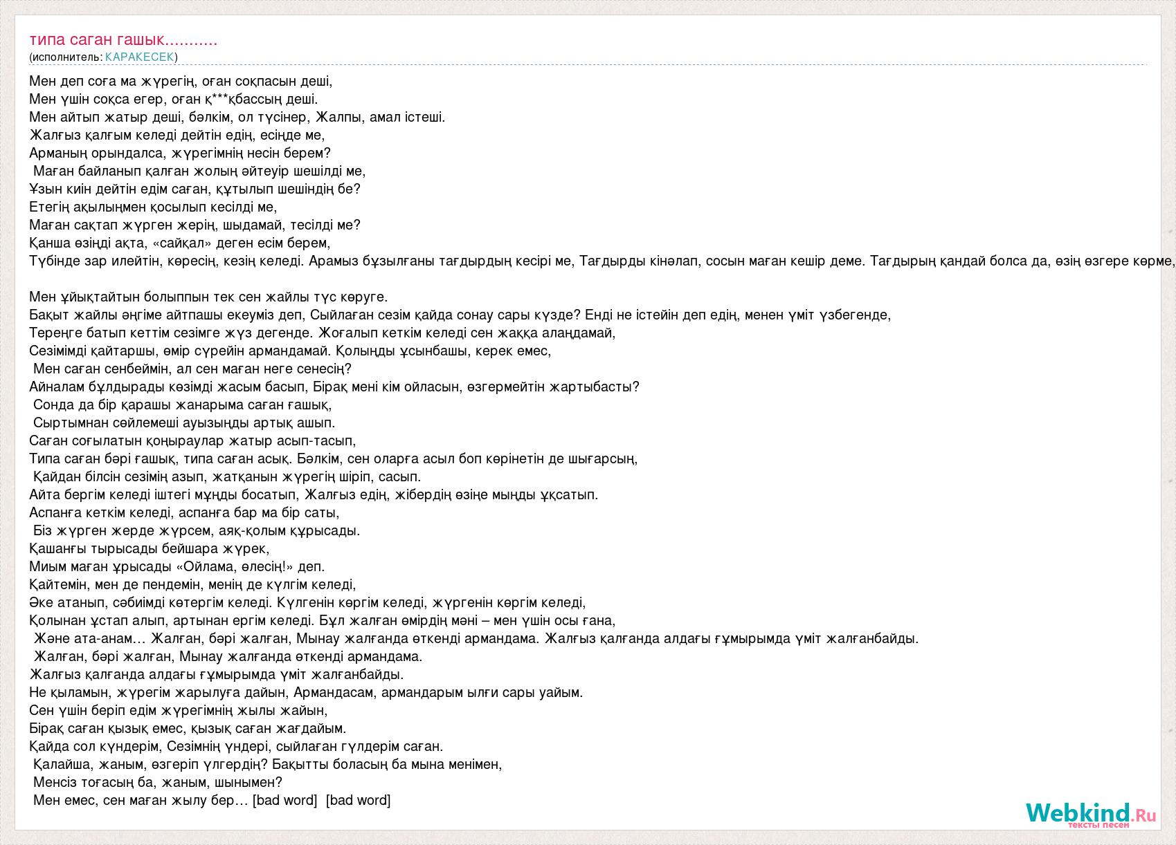Мен деп соға ма жүрегің, оған соқпасын деші, Мен үшін соқса егер, оған қ***қбассың деші. Мен айтып жатыр деші, бәлкім, ол түсінер, Жалпы, амал істеші. Жалғыз қалғым келеді дейтін едің, есіңде ме, Арманың орындалса, жүрегімнің несін берем? Маған байланып қалған жолың әйтеуір шешілді ме, Ұзын киін дейтін едім саған, құтылып шешіндің бе? Етегің ақылыңмен қосылып кесілді ме, Маған сақтап жүрген жерің, шыдамай, тесілді ме? Қанша өзіңді ақта, «сайқал» деген есім берем, Түбінде зар илейтін, көресің, кезің келеді. Арамыз бұзылғаны тағдырдың кесірі ме, Тағдырды кінәлап, сосын маған кешір деме. Тағдырың қандай болса да, өзің өзгере көрме, Мен ұйықтайтын болыппын тек сен жайлы түс көруге. Бақыт жайлы әңгіме айтпашы екеуміз деп, Сыйлаған сезім қайда сонау сары күзде? Енді не істейін деп едің, менен үміт үзбегенде, Тереңге батып кеттім сезімге жүз дегенде. Жоғалып кеткім келеді сен жаққа алаңдамай, Сезімімді қайтаршы, өмір сүрейін армандамай. Қолыңды ұсынбашы, керек емес, Мен саған сенбеймін, ал сен маған неге сенесің? Айналам бұлдырады көзімді жасым басып, Бірақ мені кім ойласын, өзгермейтін жартыбасты? Сонда да бір қарашы жанарыма саған ғашық, Сыртымнан сөйлемеші ауызыңды артық ашып. Саған соғылатын қоңыраулар жатыр асып-тасып, Типа саған бәрі ғашық, типа саған асық. Бәлкім, сен оларға асыл боп көрінетін де шығарсың, Қайдан білсін сезімің азып, жатқанын жүрегің шіріп, сасып. Айта бергім келеді іштегі мұңды босатып, Жалғыз едің, жібердің өзіңе мыңды ұқсатып. Аспанға кеткім келеді, аспанға бар ма бір саты, Біз жүрген жерде жүрсем, аяқ-қолым құрысады. Қашанғы тырысады бейшара жүрек, Миым маған ұрысады «Ойлама, өлесің!» деп. Қайтемін, мен де пендемін, менің де күлгім келеді, Әке атанып, сәбиімді көтергім келеді. Күлгенін көргім келеді, жүргенін көргім келеді, Қолынан ұстап алып, артынан ергім келеді. Бұл жалған өмірдің мәні – мен үшін осы ғана, Және ата-анам… Жалған, бәрі жалған, Мынау жалғанда өткенді армандама. Жалғыз қалғанда алдағы ғұмырымда үміт жалғанбайды. Жалған, бәрі жалған, Мынау жалғанда өткенді армандама. Жалғыз қалғанда алдағы ғұмырымда үміт жалғанбайды. Не қыламын, жүрегім жарылуға дайын, Армандасам, армандарым ылғи сары уайым. Сен үшін беріп едім жүрегімнің жылы жайын, Бірақ саған қызық емес, қызық саған жағдайым. Қайда сол күндерім, Сезімнің үндері, сыйлаған гүлдерім саған. Қалайша, жаным, өзгеріп үлгердің? Бақытты боласың ба мына менімен, Менсіз тоғасың ба, жаным, шынымен? Мен емес, сен маған жылу бер… [bad word] [bad word]