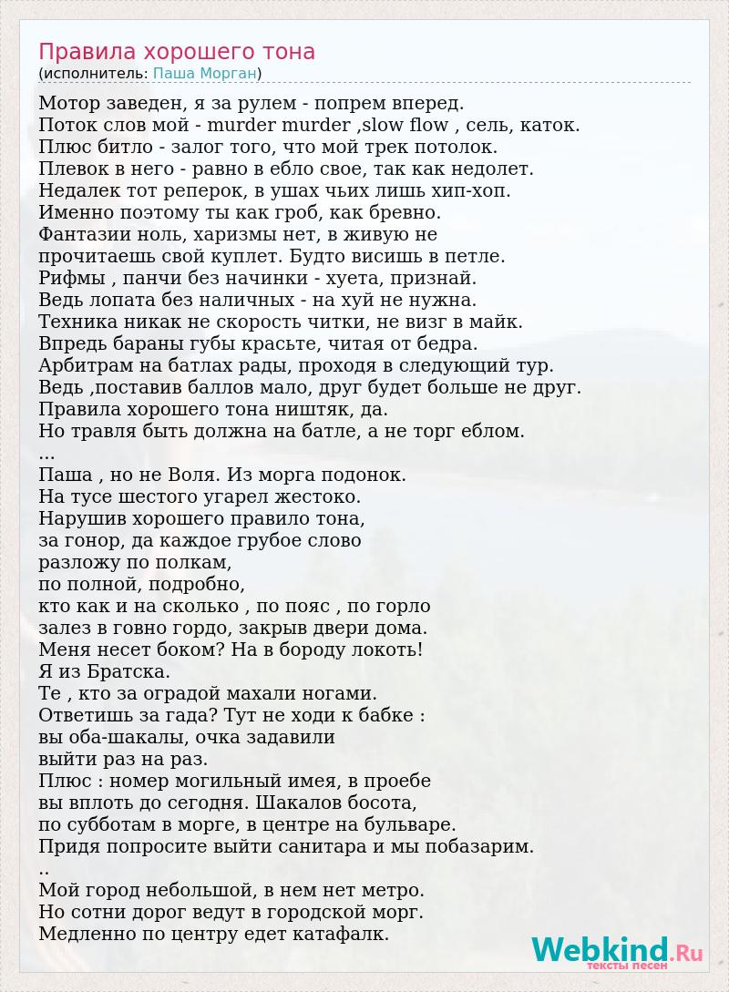 Мотор заведен, я за рулем - попрем вперед. Поток слов мой - murder murder ,slow flow , сель, каток. Плюс битло - залог того, что мой трек потолок. Плевок в него - равно в ебло свое, так как недолет. Недалек тот реперок, в ушах чьих лишь хип-хоп. Именно поэтому ты как гроб, как бревно. Фантазии ноль, харизмы нет, в живую не прочитаешь свой куплет. Будто висишь в петле. Рифмы , панчи без начинки - хуета, признай. Ведь лопата без наличных - на хуй не нужна. Техника никак не скорость читки, не визг в майк. Впредь бараны губы красьте, читая от бедра. Арбитрам на батлах рады, проходя в следующий тур. Ведь ,поставив баллов мало, друг будет больше не друг. Правила хорошего тона ништяк, да. Но травля быть должна на батле, а не торг еблом. ... Паша , но не Воля. Из морга подонок. На тусе шестого угарел жестоко. Нарушив хорошего правило тона, за гонор, да каждое грубое слово разложу по полкам, по полной, подробно, кто как и на сколько , по пояс , по горло залез в говно гордо, закрыв двери дома. Меня несет боком? На в бороду локоть! Я из Братска. Те , кто за оградой махали ногами. Ответишь за гада? Тут не ходи к бабке : вы оба-шакалы, очка задавили выйти раз на раз. Плюс : номер могильный имея, в проебе вы вплоть до сегодня. Шакалов босота, по субботам в морге, в центре на бульваре. Придя попросите выйти санитара и мы побазарим. .. Мой город небольшой, в нем нет метро. Но сотни дорог ведут в городской морг. Медленно по центру едет катафалк.