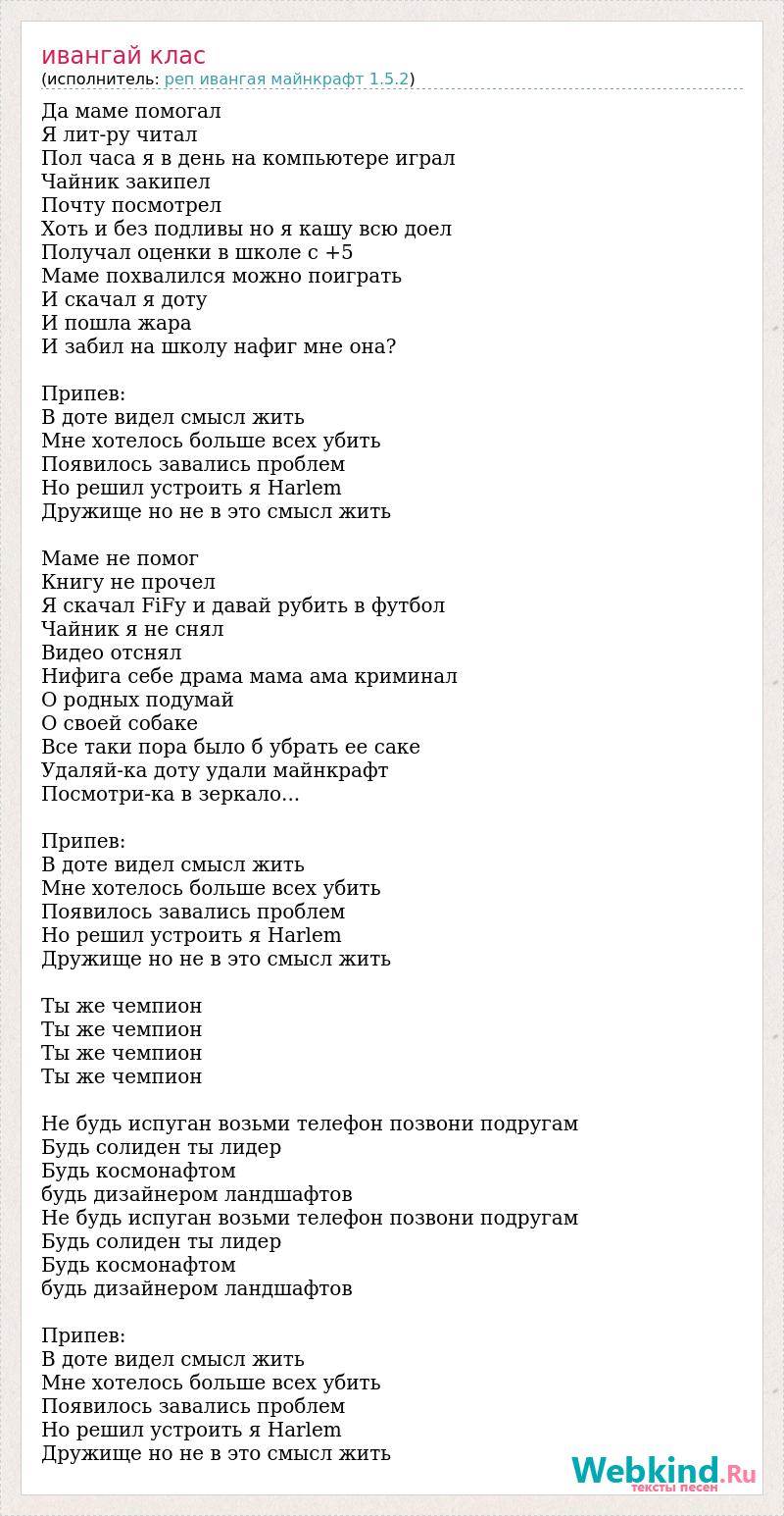 Да маме помогал Я лит-ру читал Пол часа я в день на компьютере играл Чайник закипел Почту посмотрел Хоть и без подливы но я кашу всю доел Получал оценки в школе с +5 Маме похвалился можно поиграть И скачал я доту И пошла жара И забил на школу нафиг мне она? Припев: В доте видел смысл жить Мне хотелось больше всех убить Появилось завались проблем Но решил устроить я Harlem Дружище но не в это смысл жить Маме не помог Книгу не прочел Я скачал FiFу и давай рубить в футбол Чайник я не снял Видео отснял Нифига себе драма мама ама криминал О родных подумай О своей собаке Все таки пора было б убрать ее саке Удаляй-ка доту удали майнкрафт Посмотри-ка в зеркало... Припев: В доте видел смысл жить Мне хотелось больше всех убить Появилось завались проблем Но решил устроить я Harlem Дружище но не в это смысл жить Ты же чемпион Ты же чемпион Ты же чемпион Ты же чемпион Не будь испуган возьми телефон позвони подругам Будь солиден ты лидер Будь космонафтом будь дизайнером ландшафтов Не будь испуган возьми телефон позвони подругам Будь солиден ты лидер Будь космонафтом будь дизайнером ландшафтов Припев: В доте видел смысл жить Мне хотелось больше всех убить Появилось завались проблем Но решил устроить я Harlem Дружище но не в это смысл жить