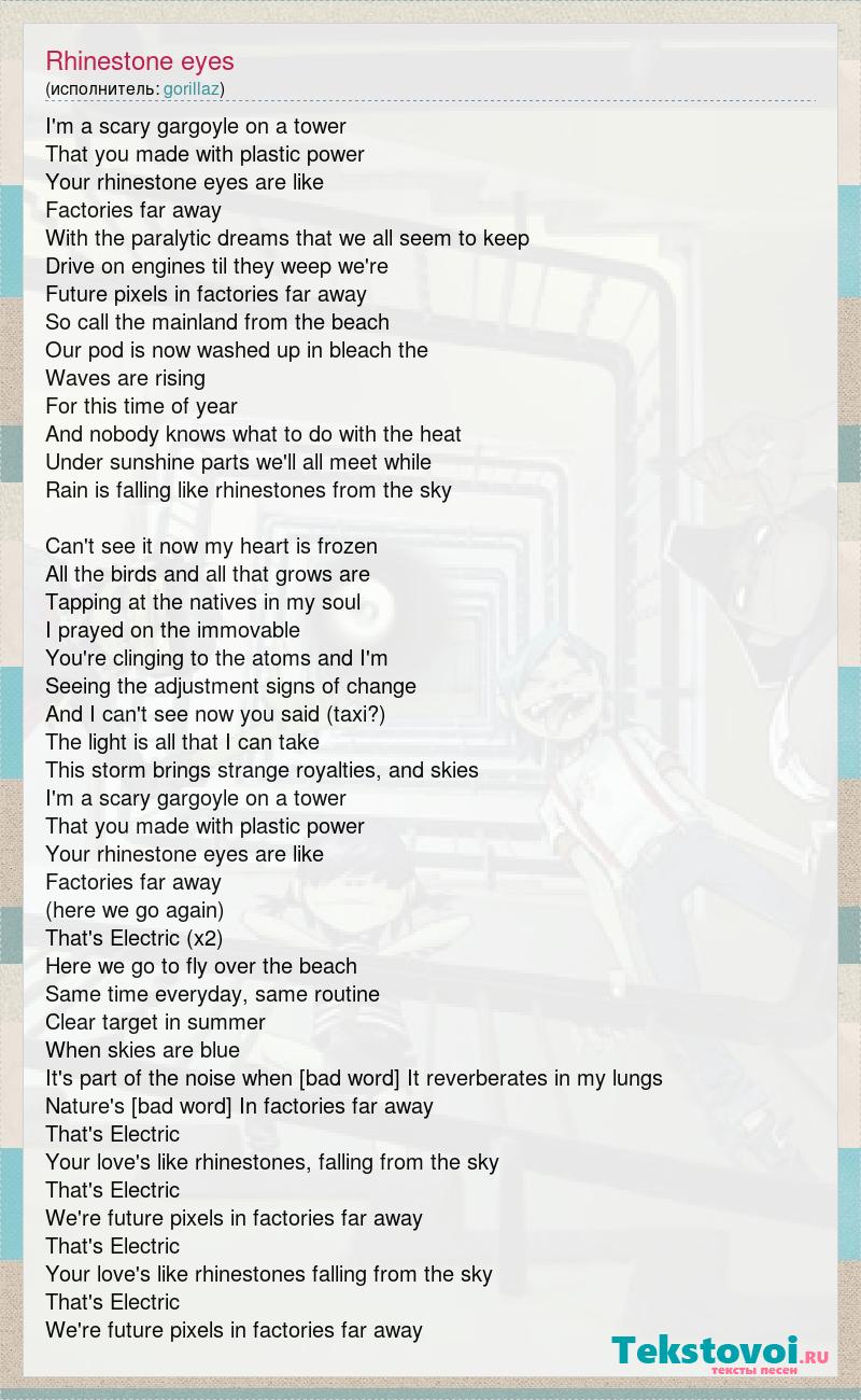 I'm a scary gargoyle on a tower That you made with plastic power Your rhinestone eyes are like Factories far away With the paralytic dreams that we all seem to keep Drive on engines til they weep we're Future pixels in factories far away So call the mainland from the beach Our pod is now washed up in bleach the Waves are rising For this time of year And nobody knows what to do with the heat Under sunshine parts we'll all meet while Rain is falling like rhinestones from the sky Can't see it now my heart is frozen All the birds and all that grows are Tapping at the natives in my soul I prayed on the immovable You're clinging to the atoms and I'm Seeing the adjustment signs of change And I can't see now you said (taxi?) The light is all that I can take This storm brings strange royalties, and skies I'm a scary gargoyle on a tower That you made with plastic power Your rhinestone eyes are like Factories far away (here we go again) That's Electric (x2) Here we go to fly over the beach Same time everyday, same routine Clear target in summer When skies are blue It's part of the noise when winter comes It reverberates in my lungs Nature's corrupted In factories far away That's Electric Your love's like rhinestones, falling from the sky That's Electric We're future pixels in factories far away That's Electric Your love's like rhinestones falling from the sky That's Electric We're future pixels in factories far away