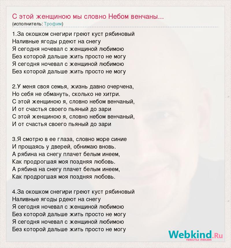 1.За окошком снегири греют куст рябиновый Наливные ягоды рдеют на снегу Я сегодня ночевал с женщиной любимою Без которой дальше жить просто не могу Я сегодня ночевал с женщиной любимою Без которой дальше жить просто не могу 2.У меня своя семья, жизнь давно очерчена, Но себя не обмануть, сколько не хитри. С этой женщиною я, словно небом венчаный, И от счастья своего пьяный до зари С этой женщиною я, словно небом венчаный, И от счастья своего пьяный до зари 3.Я смотрю в ее глаза, словно море синие И прощаясь у дверей, обнимаю вновь. А рябина на снегу плачет белым инеем, Как продрогшая моя поздняя любовь. А рябина на снегу плачет белым инеем, Как продрогшая моя поздняя любовь. 4.За окошком снегири греют куст рябиновый Наливные ягоды рдеют на снегу Я сегодня ночевал с женщиной любимою Без которой дальше жить просто не могу Я сегодня ночевал с женщиной любимою Без которой дальше жить просто не могу