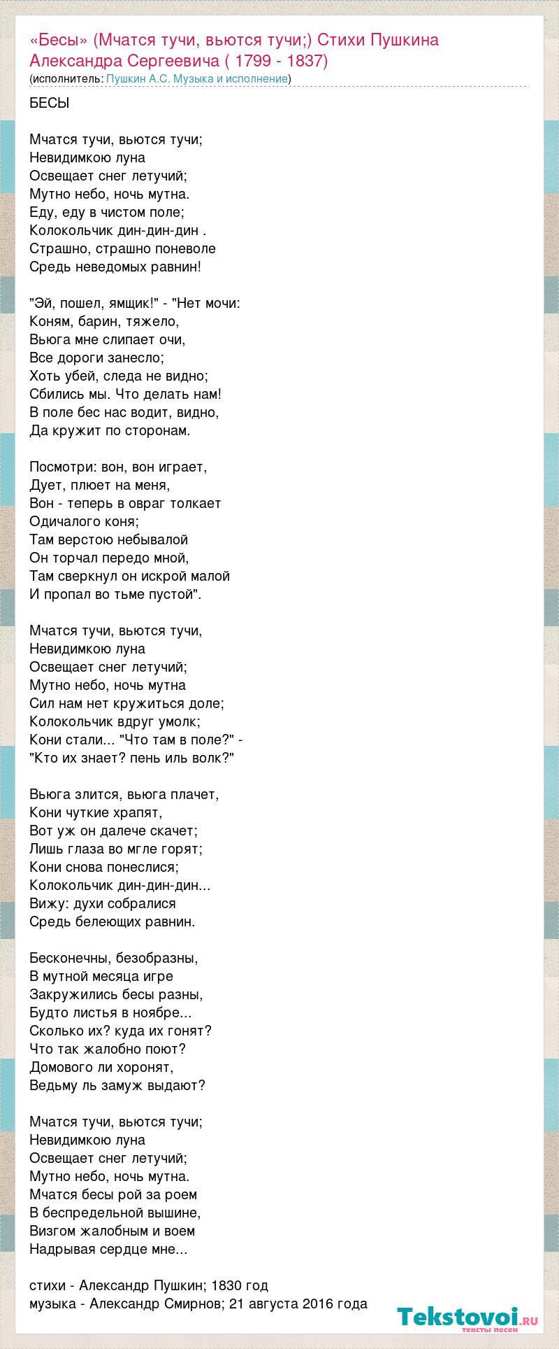 БЕСЫ Мчатся тучи, вьются тучи; Невидимкою луна Освещает снег летучий; Мутно небо, ночь мутна. Еду, еду в чистом поле; Колокольчик дин-дин-дин . Страшно, страшно поневоле Средь неведомых равнин! "Эй, пошел, ямщик!" - "Нет мочи: Коням, барин, тяжело, Вьюга мне слипает очи, Все дороги занесло; Хоть убей, следа не видно; Сбились мы. Что делать нам! В поле бес нас водит, видно, Да кружит по сторонам. Посмотри: вон, вон играет, Дует, плюет на меня, Вон - теперь в овраг толкает Одичалого коня; Там верстою небывалой Он торчал передо мной, Там сверкнул он искрой малой И пропал во тьме пустой". Мчатся тучи, вьются тучи, Невидимкою луна Освещает снег летучий; Мутно небо, ночь мутна Сил нам нет кружиться доле; Колокольчик вдруг умолк; Кони стали... "Что там в поле?" - "Кто их знает? пень иль волк?" Вьюга злится, вьюга плачет, Кони чуткие храпят, Вот уж он далече скачет; Лишь глаза во мгле горят; Кони снова понеслися; Колокольчик дин-дин-дин... Вижу: духи собралися Средь белеющих равнин. Бесконечны, безобразны, В мутной месяца игре Закружились бесы разны, Будто листья в ноябре... Сколько их? куда их гонят? Что так жалобно поют? Домового ли хоронят, Ведьму ль замуж выдают? Мчатся тучи, вьются тучи; Невидимкою луна Освещает снег летучий; Мутно небо, ночь мутна. Мчатся бесы рой за роем В беспредельной вышине, Визгом жалобным и воем Надрывая сердце мне... стихи - Александр Пушкин; 1830 год музыка - Александр Смирнов; 21 августа 2016 года