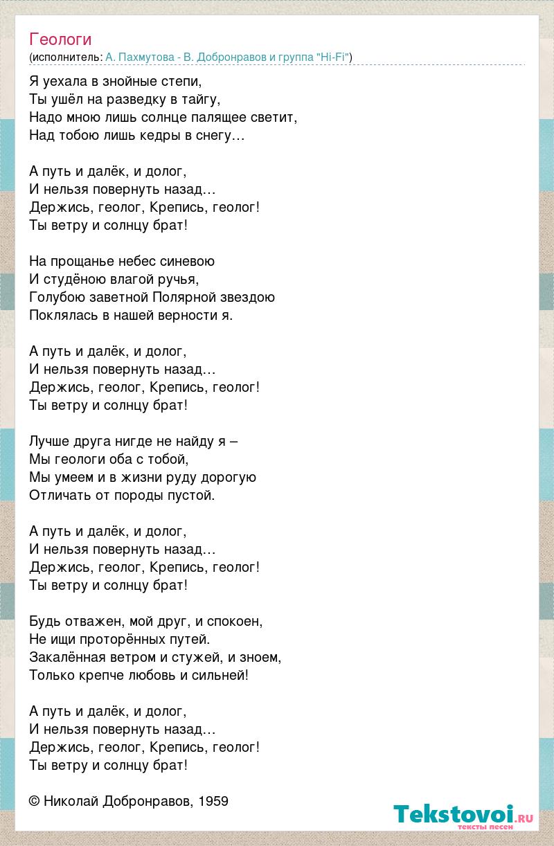 Я уехала в знойные степи, Ты ушёл на разведку в тайгу, Надо мною лишь солнце палящее светит, Над тобою лишь кедры в снегу… А путь и далёк, и долог, И нельзя повернуть назад… Держись, геолог, Крепись, геолог! Ты ветру и солнцу брат! На прощанье небес синевою И студёною влагой ручья, Голубою заветной Полярной звездою Поклялась в нашей верности я. А путь и далёк, и долог, И нельзя повернуть назад… Держись, геолог, Крепись, геолог! Ты ветру и солнцу брат! Лучше друга нигде не найду я – Мы геологи оба с тобой, Мы умеем и в жизни руду дорогую Отличать от породы пустой. А путь и далёк, и долог, И нельзя повернуть назад… Держись, геолог, Крепись, геолог! Ты ветру и солнцу брат! Будь отважен, мой друг, и спокоен, Не ищи проторённых путей. Закалённая ветром и стужей, и зноем, Только крепче любовь и сильней! А путь и далёк, и долог, И нельзя повернуть назад… Держись, геолог, Крепись, геолог! Ты ветру и солнцу брат! © Николай Добронравов, 1959