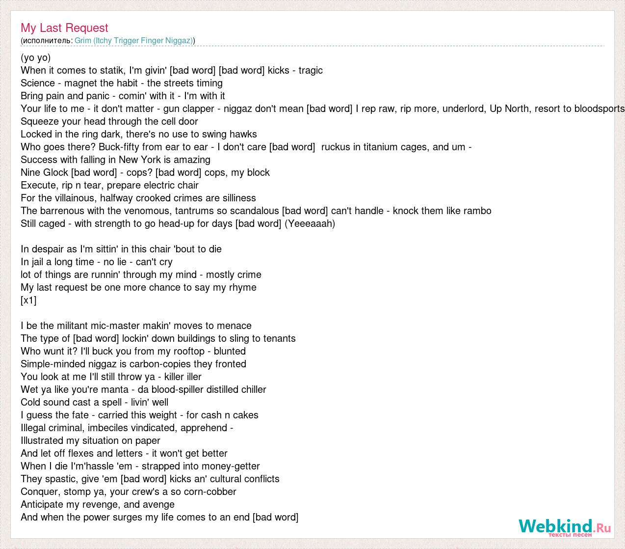 (yo yo) When it comes to statik, I'm givin' [bad word] [bad word] kicks - tragic Science - magnet the habit - the streets timing Bring pain and panic - comin' with it - I'm with it Your life to me - it don't matter - gun clapper - niggaz don't mean [bad word] I rep raw, rip more, underlord, Up North, resort to bloodsports Squeeze your head through the cell door Locked in the ring dark, there's no use to swing hawks Who goes there? Buck-fifty from ear to ear - I don't care [bad word] ruckus in titanium cages, and um - Success with falling in New York is amazing Nine Glock [bad word] - cops? [bad word] cops, my block Execute, rip n tear, prepare electric chair For the villainous, halfway crooked crimes are silliness The barrenous with the venomous, tantrums so scandalous [bad word] can't handle - knock them like rambo Still caged - with strength to go head-up for days [bad word] (Yeeeaaah) In despair as I'm sittin' in this chair 'bout to die In jail a long time - no lie - can't cry lot of things are runnin' through my mind - mostly crime My last request be one more chance to say my rhyme [x1] I be the militant mic-master makin' moves to menace The type of [bad word] lockin' down buildings to sling to tenants Who wunt it? I'll buck you from my rooftop - blunted Simple-minded niggaz is carbon-copies they fronted You look at me I'll still throw ya - killer iller Wet ya like you're manta - da blood-spiller distilled chiller Cold sound cast a spell - livin' well I guess the fate - carried this weight - for cash n cakes Illegal criminal, imbeciles vindicated, apprehend - Illustrated my situation on paper And let off flexes and letters - it won't get better When I die I'm'hassle 'em - strapped into money-getter They spastic, give 'em [bad word] kicks an' cultural conflicts Conquer, stomp ya, your crew's a so corn-cobber Anticipate my revenge, and avenge And when the power surges my life comes to an end [bad word]