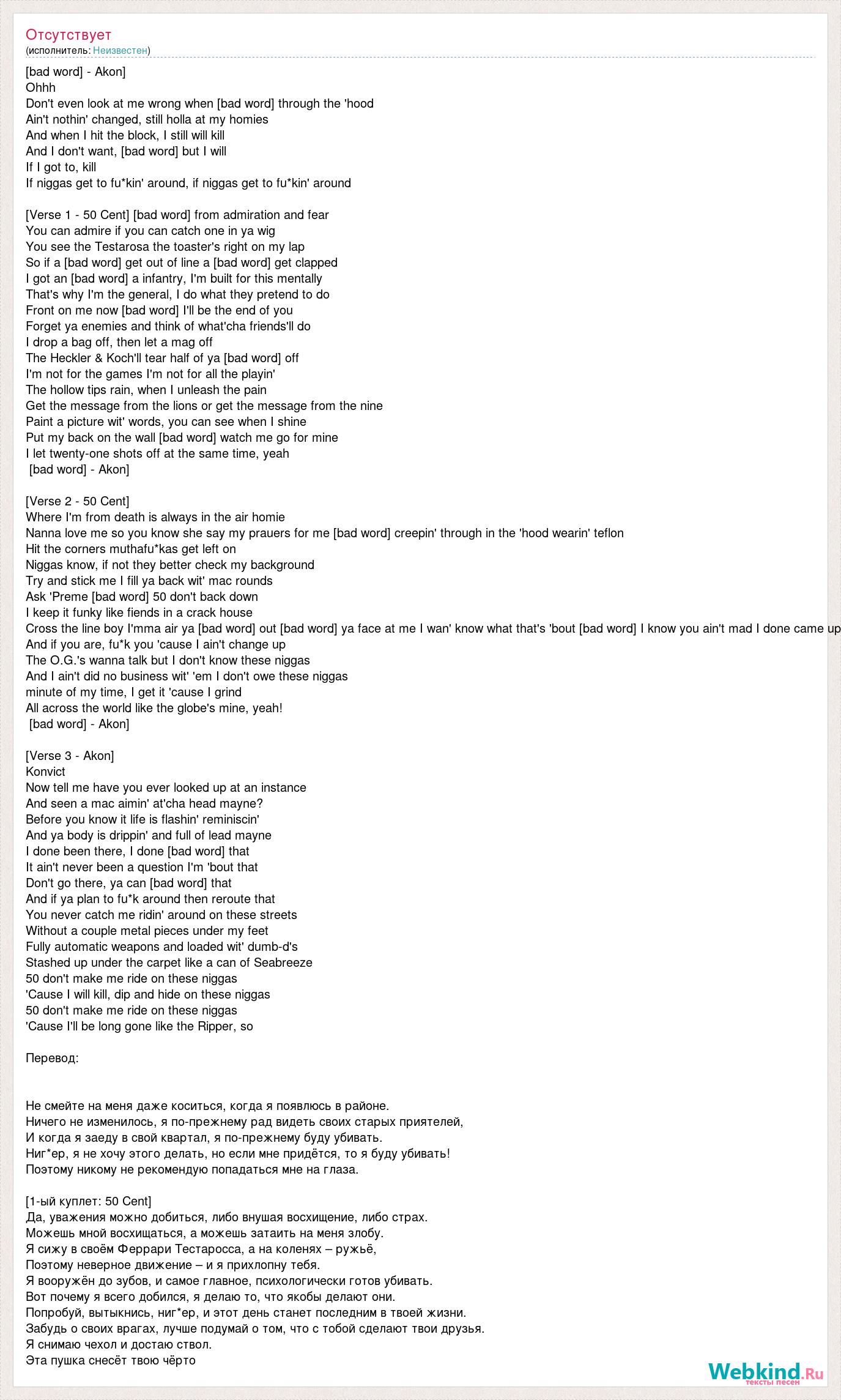 [bad word] - Akon] Ohhh Don't even look at me wrong when [bad word] through the 'hood Ain't nothin' changed, still holla at my homies And when I hit the block, I still will kill And I don't want, [bad word] but I will If I got to, kill If niggas get to fu*kin' around, if niggas get to fu*kin' around [Verse 1 - 50 Cent] [bad word] from admiration and fear You can admire if you can catch one in ya wig You see the Testarosa the toaster's right on my lap So if a [bad word] get out of line a [bad word] get clapped I got an [bad word] a infantry, I'm built for this mentally That's why I'm the general, I do what they pretend to do Front on me now [bad word] I'll be the end of you Forget ya enemies and think of what'cha friends'll do I drop a bag off, then let a mag off The Heckler & Koch'll tear half of ya [bad word] off I'm not for the games I'm not for all the playin' The hollow tips rain, when I unleash the pain Get the message from the lions or get the message from the nine Paint a picture wit' words, you can see when I shine Put my back on the wall [bad word] watch me go for mine I let twenty-one shots off at the same time, yeah [bad word] - Akon] [Verse 2 - 50 Cent] Where I'm from death is always in the air homie Nanna love me so you know she say my prauers for me [bad word] creepin' through in the 'hood wearin' teflon Hit the corners muthafu*kas get left on Niggas know, if not they better check my background Try and stick me I fill ya back wit' mac rounds Ask 'Preme [bad word] 50 don't back down I keep it funky like fiends in a crack house Cross the line boy I'mma air ya [bad word] out [bad word] ya face at me I wan' know what that's 'bout [bad word] I know you ain't mad I done came up And if you are, fu*k you 'cause I ain't change up The O.G.'s wanna talk but I don't know these niggas And I ain't did no business wit' 'em I don't owe these niggas minute of my time, I get it 'cause I grind All across the world like the globe's mine, yeah! [bad word] - Akon] [Verse 3 - Akon] Konvict Now tell me have you ever looked up at an instance And seen a mac aimin' at'cha head mayne? Before you know it life is flashin' reminiscin' And ya body is drippin' and full of lead mayne I done been there, I done [bad word] that It ain't never been a question I'm 'bout that Don't go there, ya can [bad word] that And if ya plan to fu*k around then reroute that You never catch me ridin' around on these streets Without a couple metal pieces under my feet Fully automatic weapons and loaded wit' dumb-d's Stashed up under the carpet like a can of Seabreeze 50 don't make me ride on these niggas 'Cause I will kill, dip and hide on these niggas 50 don't make me ride on these niggas 'Cause I'll be long gone like the Ripper, so Перевод: Не смейте на меня даже коситься, когда я появлюсь в районе. Ничего не изменилось, я по-прежнему рад видеть своих старых приятелей, И когда я заеду в свой квартал, я по-прежнему буду убивать. Ниг*ер, я не хочу этого делать, но если мне придётся, то я буду убивать! Поэтому никому не рекомендую попадаться мне на глаза. [1-ый куплет: 50 Cent] Да, уважения можно добиться, либо внушая восхищение, либо страх. Можешь мной восхищаться, а можешь затаить на меня злобу. Я сижу в своём Феррари Тестаросса, а на коленях – ружьё, Поэтому неверное движение – и я прихлопну тебя. Я вооружён до зубов, и самое главное, психологически готов убивать. Вот почему я всего добился, я делаю то, что якобы делают они. Попробуй, вытыкнись, ниг*ер, и этот день станет последним в твоей жизни. Забудь о своих врагах, лучше подумай о том, что с тобой сделают твои друзья. Я снимаю чехол и достаю ствол. Эта пушка снесёт твою чёрто
