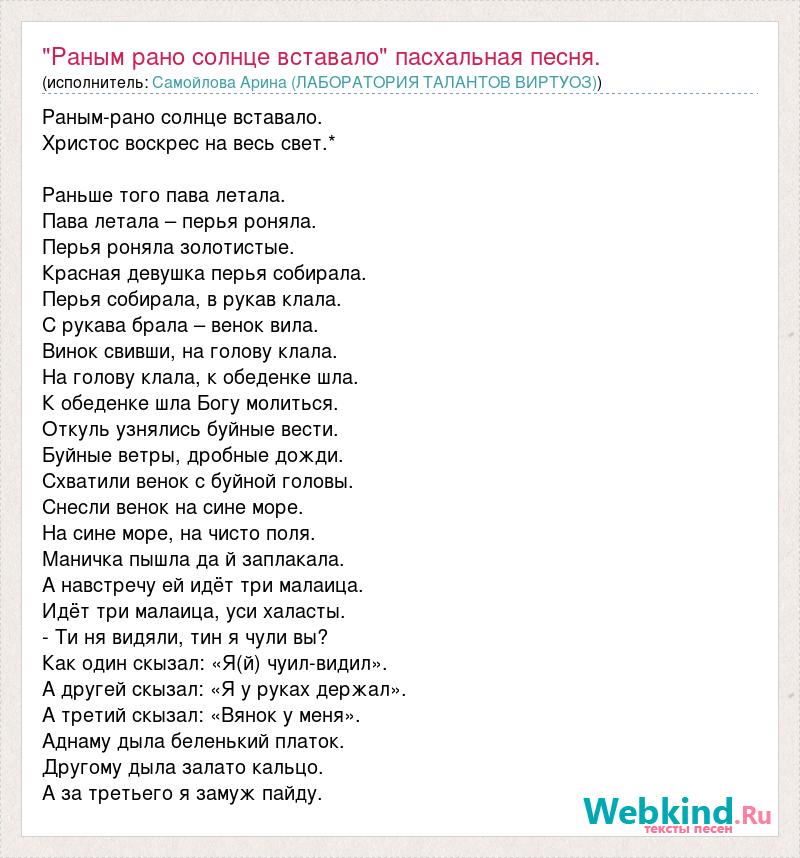 Раным-рано солнце вставало. Христос воскрес на весь свет.* Раньше того пава летала. Пава летала – перья роняла. Перья роняла золотистые. Красная девушка перья собирала. Перья собирала, в рукав клала. С рукава брала – венок вила. Винок свивши, на голову клала. На голову клала, к обеденке шла. К обеденке шла Богу молиться. Откуль узнялись буйные вести. Буйные ветры, дробные дожди. Схватили венок с буйной головы. Снесли венок на сине море. На сине море, на чисто поля. Маничка пышла да й заплакала. А навстречу ей идёт три малаица. Идёт три малаица, уси халасты. - Ти ня видяли, тин я чули вы? Как один скызал: «Я(й) чуил-видил». А другей скызал: «Я у руках держал». А третий скызал: «Вянок у меня». Аднаму дыла беленький платок. Другому дыла залато кальцо. А за третьего я замуж пайду.