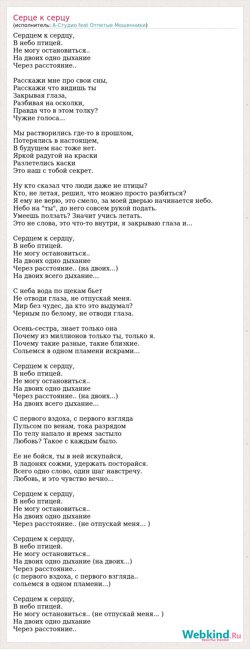 Сердцем к сердцу, В небо птицей. Не могу остановиться.. На двоих одно дыхание Через расстояние.. Расскажи мне про свои сны, Расскажи что видишь ты Закрывая глаза, Разбивая на осколки, Правда что в этом толку? Чужие голоса... Мы растворились где-то в прошлом, Потерялись в настоящем, В будущем нас тоже нет. Яркой радугой на краски Разлетелись каски Это наш с тобой секрет. Ну кто сказал что люди даже не птицы? Кто, не летая, решил, что можно просто разбиться? Я ему не верю, это смело, за моей дверью начинается небо. Небо на "ты", до него совсем рукой подать. Умеешь ползать? Значит учись летать. Это не слова, это что-то внутри, я закрываю глаза и... Сердцем к сердцу, В небо птицей. Не могу остановиться.. На двоих одно дыхание Через расстояние.. (на двоих...) На двоих всего дыхание... С неба вода по щекам бьет Не отводи глаза, не отпускай меня. Мир без чудес, да кто это выдумал? Черным по белому, не отводи глаза. Осень-сестра, знает только она Почему из миллионов только ты, только я. Почему такие разные, такие близкие. Сольемся в одном пламени искрами... Сердцем к сердцу, В небо птицей. Не могу остановиться.. На двоих одно дыхание Через расстояние.. (на двоих...) На двоих всего дыхание... С первого вздоха, с первого взгляда Пульсом по венам, тока разрядом По телу напало и время застыло Любовь? Такое с каждым было. Ее не бойся, ты в ней искупайся, В ладонях сожми, удержать посторайся. Всего одно слово, один шаг навстречу. Любовь, и это чувство вечно... Сердцем к сердцу, В небо птицей. Не могу остановиться.. На двоих одно дыхание Через расстояние.. (не отпускай меня... ) Сердцем к сердцу, В небо птицей. Не могу остановиться.. На двоих одно дыхание (на двоих...) Через расстояние.. (с первого вздоха, с первого взгляда.. сольемся в одном пламени...) Сердцем к сердцу, В небо птицей. Не могу остановиться.. (не отпускай меня... ) На двоих одно дыхание Через расстояние..