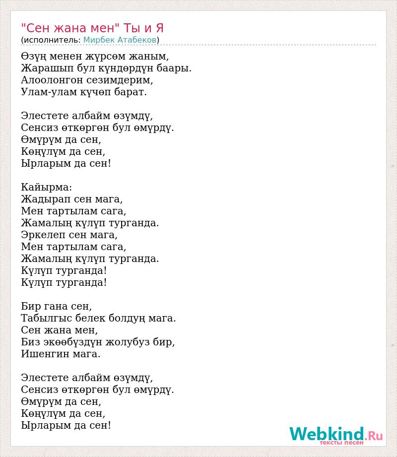 Өзүң менен жүрсөм жаным, Жарашып бул күндөрдүн баары. Алоолонгон сезимдерим, Улам-улам күчөп барат. Элестете албайм өзүмдү, Сенсиз өткөргөн бул өмүрдү. Өмүрүм да сен, Көңүлүм да сен, Ырларым да сен! Кайырма: Жадырап сен мага, Мен тартылам сага, Жамалың күлүп турганда. Эркелеп сен мага, Мен тартылам сага, Жамалың күлүп турганда. Күлүп турганда! Күлүп турганда! Бир гана сен, Табылгыс белек болдуң мага. Сен жана мен, Биз экөөбүздүн жолубуз бир, Ишенгин мага. Элестете албайм өзүмдү, Сенсиз өткөргөн бул өмүрдү. Өмүрүм да сен, Көңүлүм да сен, Ырларым да сен!
