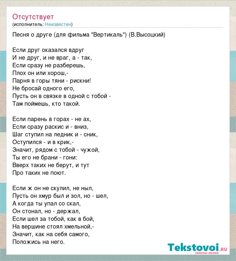 Песня о друге (для фильма "Вертикаль") (В.Высоцкий) Если друг оказался вдруг И не друг, и не враг, а - так, Если сразу не разберешь, Плох он или хорош,- Парня в горы тяни - рискни! Не бросай одного его, Пусть он в связке в одной с тобой - Там поймешь, кто такой. Если парень в горах - не ах, Если сразу раскис и - вниз, Шаг ступил на ледник и - сник, Оступился - и в крик,- Значит, рядом с тобой - чужой, Ты его не брани - гони: Вверх таких не берут, и тут Про таких не поют. Если ж он не скулил, не ныл, Пусть он хмур был и зол, но - шел, А когда ты упал со скал, Он стонал, но - держал, Если шел за тобой, как в бой, На вершине стоял хмельной,- Значит, как на себя самого, Положись на него.