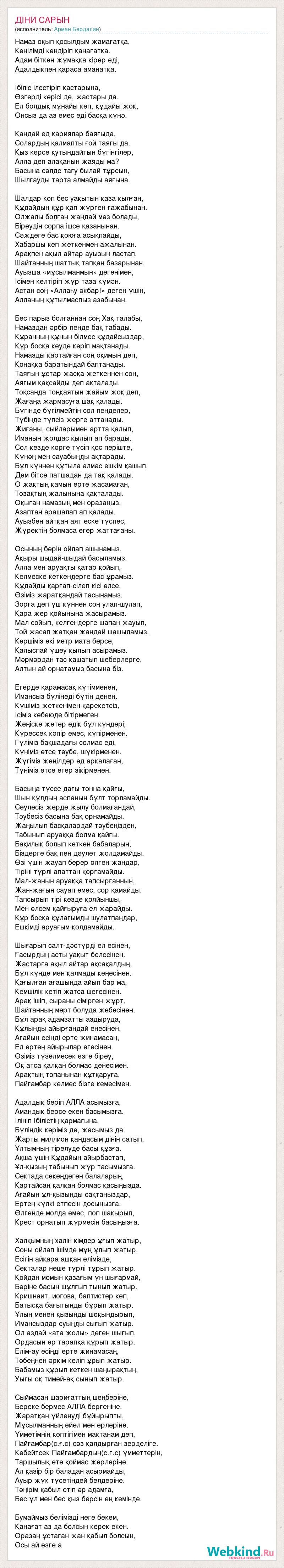 Намаз оқып қосылдым жамағатқа, Көңілімді көндіріп қанағатқа. Адам біткен жұмаққа кірер еді, Адалдықпен қараса аманатқа. Ібіліс ілестіріп қастарына, Өзгерді кәрісі де, жастары да. Ел болдық мұнайы көп, құдайы жоқ, Онсыз да аз емес еді басқа күнә. Қандай ед қариялар баяғыда, Солардың қалмапты ғой таяғы да. Қыз көрсе қутындайтын бүгінгілер, Алла деп алақанын жаяды ма? Басына сәлде тағу былай тұрсын, Шылғауды тарта алмайды аяғына. Шалдар көп бес уақытын қаза қылған, Құдайдың құр қап жүрген ғажабынан. Олжалы болған жандай мәз болады, Біреудің сорпа ішсе қазанынан. Сәждеге бас қоюға асықпайды, Хабаршы кеп жеткенмен ажалынан. Арақпен ақыл айтар ауызын ластап, Шайтанның шаттық тапқан базарынан. Ауызша «мұсылманмын» дегенімен, Ісімен келтіріп жүр таза күмән. Астан соң «Аллаһу әкбар!» деген үшін, Алланың құтылмаспыз азабынан. Бес парыз болғаннан соң Хақ талабы, Намаздан әрбір пенде бақ табады. Құранның құнын білмес құдайсыздар, Құр босқа кеуде керіп мақтанады. Намазды қартайған соң оқимын деп, Қонаққа баратындай баптанады. Таяғын ұстар жасқа жеткеннен соң, Аяғым қақсайды деп ақталады. Тоқсанда тоңқаятын жайым жоқ деп, Жағаңа жармасуға шақ қалады. Бүгінде бүгілмейтін сол пенделер, Түбінде түпсіз жерге аттанады. Жиғаны, сыйларымен артта қалып, Иманын жолдас қылып ап барады. Сол кезде көрге түсіп қос періште, Күнәң мен сауабыңды ақтарады. Бұл күннен құтыла алмас ешкім қашып, Дәм бітсе патшадан да тақ қалады. О жақтың қамын ерте жасамаған, Тозақтың жалынына қақталады. Оқыған намазың мен оразаңыз, Азаптан арашалап ап қалады. Ауызбен айтқан аят еске түспес, Жүректің болмаса егер жаттағаны. Осының бәрін ойлап ашынамыз, Ақыры шыдай-шыдай басыламыз. Алла мен аруақты қатар қойып, Келмеске кеткендерге бас ұрамыз. Құдайды қарғап-сілеп кісі өлсе, Өзіміз жаратқандай тасынамыз. Зорға деп үш күннен соң улап-шулап, Қара жер қойынына жасырамыз. Мал сойып, келгендерге шапан жауып, Той жасап жатқан жандай шашыламыз. Көршіміз екі метр мата берсе, Қалыспай үшеу қылып асырамыз. Мәрмәрдан тас қашатып шеберлерге, Алтын ай орнатамыз басына біз. Егерде қарамасақ күтімменен, Имансыз бүлінеді бүтін денең. Күшіміз жеткенімен қарекетсіз, Ісіміз көбеюде бітірмеген. Жеңіске жетер едік бұл күндері, Күрессек кәпір емес, күпірменен. Гүліміз бақшадағы солмас еді, Күніміз өтсе тәубе, шүкірменен. Жүгіміз жеңілдер ед арқалаған, Түніміз өтсе егер зікірменен. Басыңа түссе дағы тонна қайғы, Шын құлдың аспанын бұлт торламайды. Сәулесіз жерде жылу болмағандай, Тәубесіз басыңа бақ орнамайды. Жаңылып басқалардай тәубеңізден, Табынып аруаққа болма қайғы. Бақилық болып кеткен бабаларың, Біздерге бақ пен дәулет жолдамайды. Өзі үшін жауап берер өлген жандар, Тіріні түрлі апаттан қорғамайды. Мал-жанын аруаққа тапсырғаннын, Жан-жағын сауап емес, сор қамайды. Тапсырып тірі кезде қояйыншы, Мен өлсем қайғыруға ел жарайды. Құр босқа құлағымды шулатпаңдар, Ешкімді аруағым қолдамайды. Шығарып салт-дәстүрді ел есінен, Ғасырдың асты уақыт белесінен. Жастарға ақыл айтар ақсақалдың, Бұл күнде мән қалмады кеңесінен. Қағылған ағашыңда айып бар ма, Кемшілік кетіп жатса шегесінен. Арақ ішіп, сыраны сімірген жұрт, Шайтанның мерт болуда жебесінен. Бұл арақ адамзатты аздыруда, Құлынды айырғандай енесінен. Ағайын есіңді ерте жинамасаң, Ел ертең айырылар егесінен. Өзіміз түзелмесек өзге біреу, Оқ атса қал