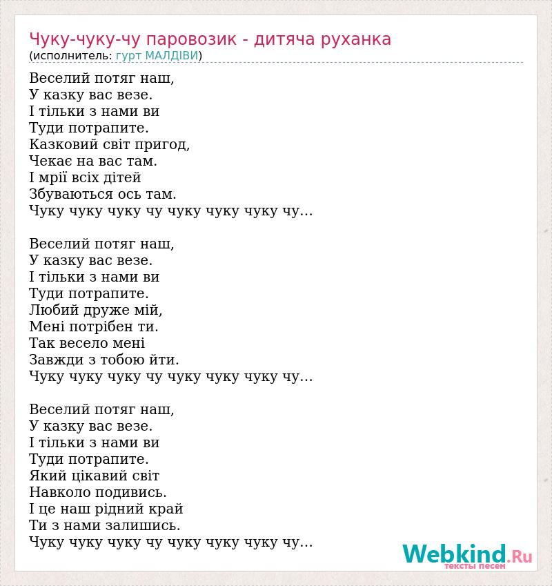 Веселий потяг наш, У казку вас везе. І тільки з нами ви Туди потрапите. Казковий світ пригод, Чекає на вас там. І мрії всіх дітей Збуваються ось там. Чуку чуку чуку чу чуку чуку чуку чу… Веселий потяг наш, У казку вас везе. І тільки з нами ви Туди потрапите. Любий друже мій, Мені потрібен ти. Так весело мені Завжди з тобою йти. Чуку чуку чуку чу чуку чуку чуку чу… Веселий потяг наш, У казку вас везе. І тільки з нами ви Туди потрапите. Який цікавий світ Навколо подивись. І це наш рідний край Ти з нами залишись. Чуку чуку чуку чу чуку чуку чуку чу…