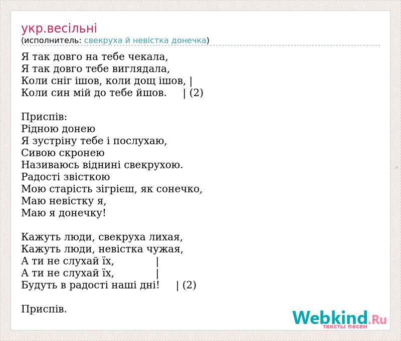 Я так довго на тебе чекала, Я так довго тебе виглядала, Коли сніг ішов, коли дощ ішов, | Коли син мій до тебе йшов. | (2) Приспів: Рідною донею Я зустріну тебе і послухаю, Сивою скронею Називаюсь віднині свекрухою. Радості звісткою Мою старість зігрієш, як сонечко, Маю невістку я, Маю я донечку! Кажуть люди, свекруха лихая, Кажуть люди, невістка чужая, А ти не слухай їх, | А ти не слухай їх, | Будуть в радості наші дні! | (2) Приспів.