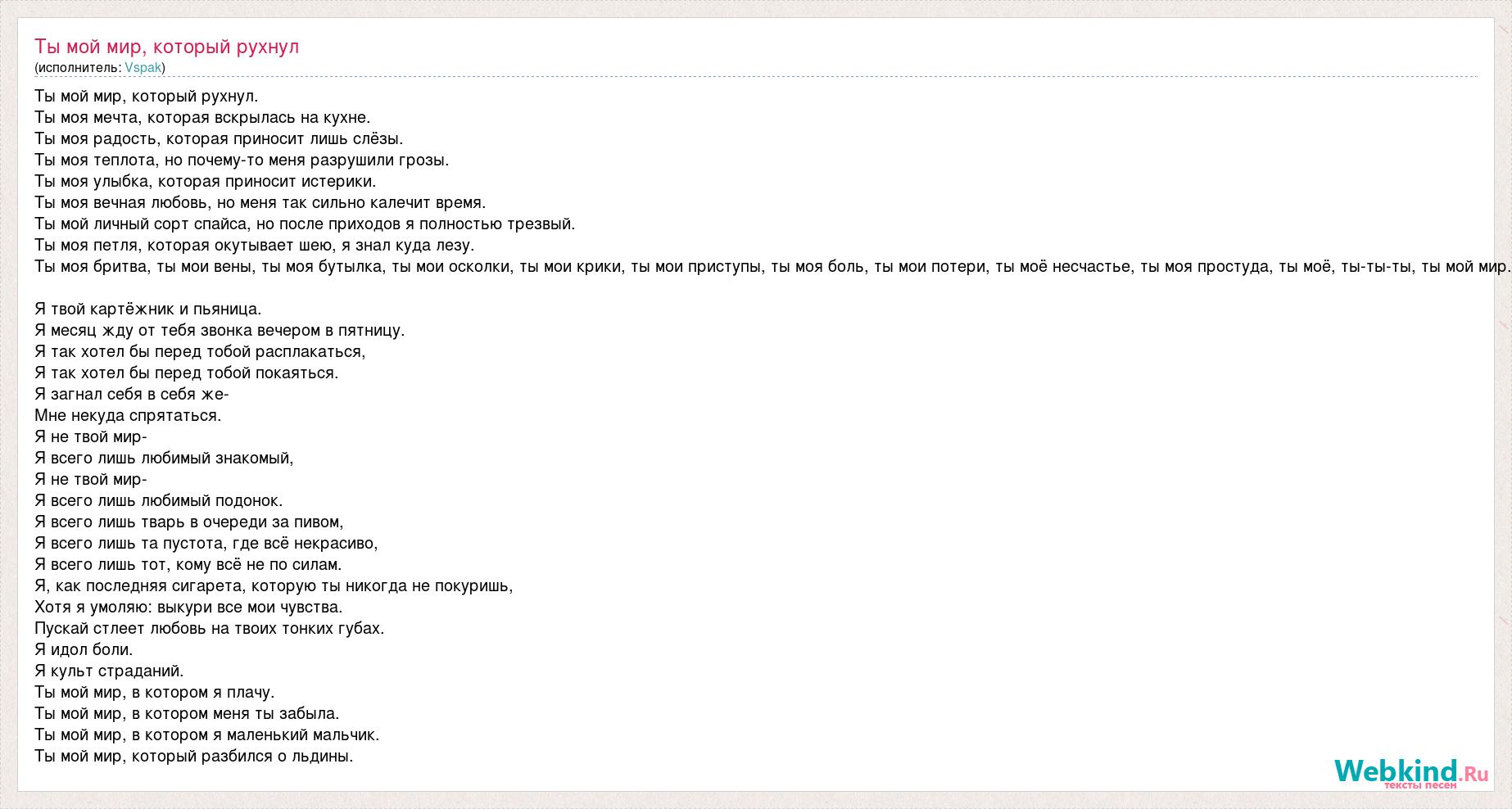 Ты мой мир, который рухнул. Ты моя мечта, которая вскрылась на кухне. Ты моя радость, которая приносит лишь слёзы. Ты моя теплота, но почему-то меня разрушили грозы. Ты моя улыбка, которая приносит истерики. Ты моя вечная любовь, но меня так сильно калечит время. Ты мой личный сорт спайса, но после приходов я полностью трезвый. Ты моя петля, которая окутывает шею, я знал куда лезу. Ты моя бритва, ты мои вены, ты моя бутылка, ты мои осколки, ты мои крики, ты мои приступы, ты моя боль, ты мои потери, ты моё несчастье, ты моя простуда, ты моё, ты-ты-ты, ты мой мир. Я твой картёжник и пьяница. Я месяц жду от тебя звонка вечером в пятницу. Я так хотел бы перед тобой расплакаться, Я так хотел бы перед тобой покаяться. Я загнал себя в себя же- Мне некуда спрятаться. Я не твой мир- Я всего лишь любимый знакомый, Я не твой мир- Я всего лишь любимый подонок. Я всего лишь тварь в очереди за пивом, Я всего лишь та пустота, где всё некрасиво, Я всего лишь тот, кому всё не по силам. Я, как последняя сигарета, которую ты никогда не покуришь, Хотя я умоляю: выкури все мои чувства. Пускай стлеет любовь на твоих тонких губах. Я идол боли. Я культ страданий. Ты мой мир, в котором я плачу. Ты мой мир, в котором меня ты забыла. Ты мой мир, в котором я маленький мальчик. Ты мой мир, который разбился о льдины.