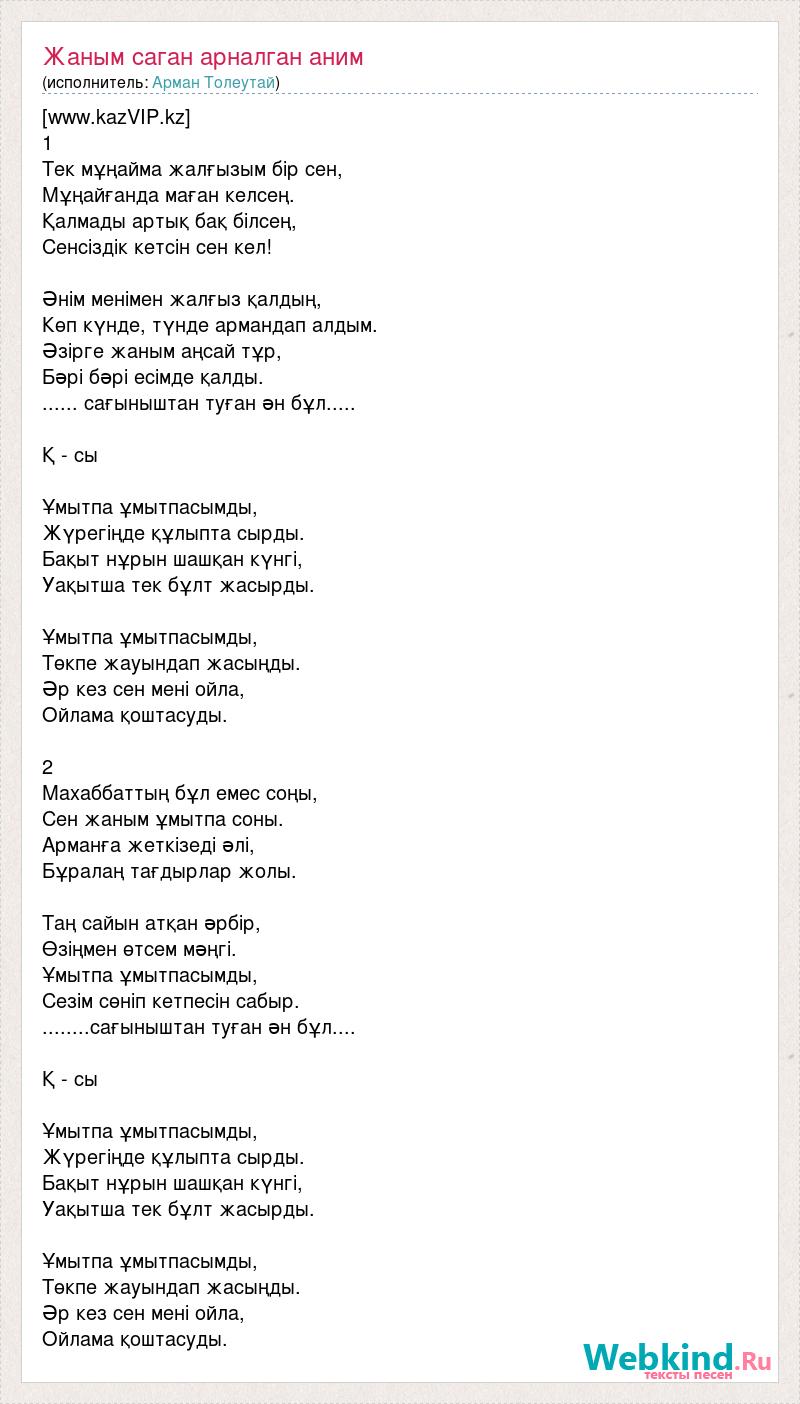 [www.kazVIP.kz] 1 Тек мұңайма жалғызым бір сен, Мұңайғанда маған келсең. Қалмады артық бақ білсең, Сенсіздік кетсін сен кел! Əнім менімен жалғыз қалдың, Көп күнде, түнде армандап алдым. Əзірге жаным аңсай тұр, Бəрі бəрі есімде қалды. ...... сағыныштан туған əн бұл..... Қ - сы Ұмытпа ұмытпасымды, Жүрегіңде құлыпта сырды. Бақыт нұрын шашқан күнгі, Уақытша тек бұлт жасырды. Ұмытпа ұмытпасымды, Төкпе жауындап жасыңды. Əр кез сен мені ойла, Ойлама қоштасуды. 2 Махаббаттың бұл емес соңы, Сен жаным ұмытпа соны. Арманға жеткізеді əлі, Бұралаң тағдырлар жолы. Таң сайын атқан əрбір, Өзіңмен өтсем мəңгі. Ұмытпа ұмытпасымды, Сезім сөніп кетпесін сабыр. ........сағыныштан туған əн бұл.... Қ - сы Ұмытпа ұмытпасымды, Жүрегіңде құлыпта сырды. Бақыт нұрын шашқан күнгі, Уақытша тек бұлт жасырды. Ұмытпа ұмытпасымды, Төкпе жауындап жасыңды. Əр кез сен мені ойла, Ойлама қоштасуды.