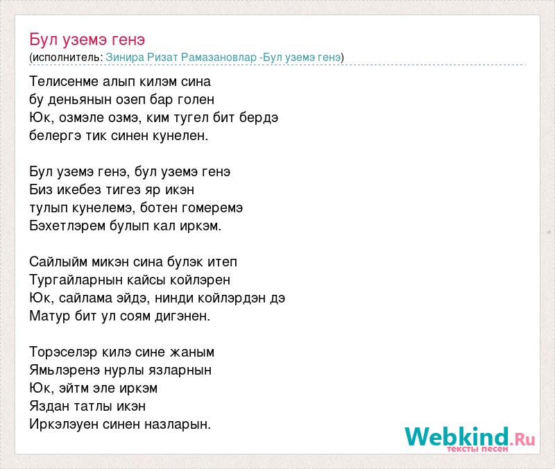 Телисенме алып килэм сина бу деньянын озеп бар голен Юк, озмэле озмэ, ким тугел бит бердэ белергэ тик синен кунелен. Бул уземэ генэ, бул уземэ генэ Биз икебез тигез яр икэн тулып кунелемэ, ботен гомеремэ Бэхетлэрем булып кал иркэм. Сайлыйм микэн сина булэк итеп Тургайларнын кайсы койлэрен Юк, сайлама эйдэ, нинди койлэрдэн дэ Матур бит ул соям дигэнен. Торэселэр килэ сине жаным Ямьлэренэ нурлы язларнын Юк, эйтм эле иркэм Яздан татлы икэн Иркэлэуен синен назларын.