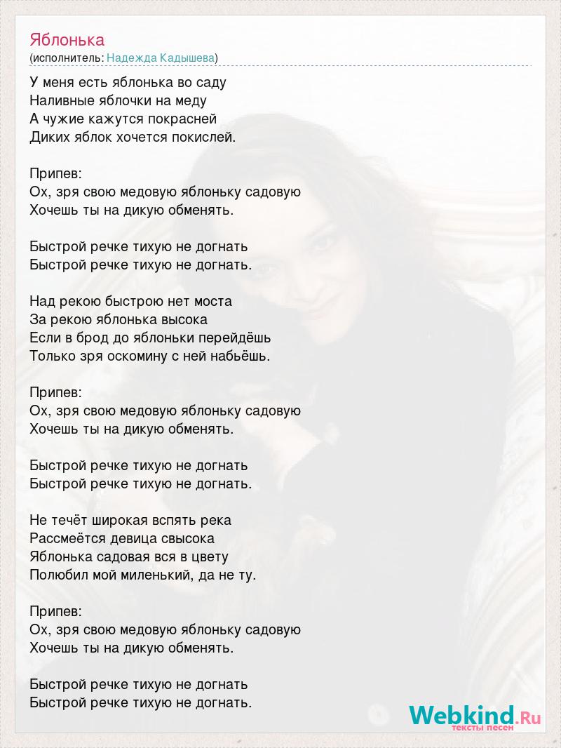 У меня есть яблонька во саду Наливные яблочки на меду А чужие кажутся покрасней Диких яблок хочется покислей. Припев: Ох, зря свою медовую яблоньку садовую Хочешь ты на дикую обменять. Быстрой речке тихую не догнать Быстрой речке тихую не догнать. Над рекою быстрою нет моста За рекою яблонька высока Если в брод до яблоньки перейдёшь Только зря оскомину с ней набьёшь. Припев: Ох, зря свою медовую яблоньку садовую Хочешь ты на дикую обменять. Быстрой речке тихую не догнать Быстрой речке тихую не догнать. Не течёт широкая вспять река Рассмеётся девица свысока Яблонька садовая вся в цвету Полюбил мой миленький, да не ту. Припев: Ох, зря свою медовую яблоньку садовую Хочешь ты на дикую обменять. Быстрой речке тихую не догнать Быстрой речке тихую не догнать.