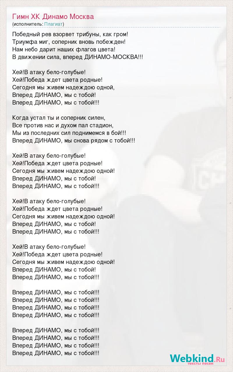 Победный рев взорвет трибуны, как гром! Триумфа миг, соперник вновь побежден! Нам небо дарит наших флагов цвета! В движении сила, вперед ДИНАМО-МОСКВА!!! Хей!В атаку бело-голубые! Хей!Победа ждет цвета родные! Сегодня мы живем надеждою одной, Вперед ДИНАМО, мы с тобой! Вперед ДИНАМО, мы с тобой!!! Когда устал ты и соперник силен, Все против нас и духом пал стадион, Мы из последних сил поднимемся в бой!!! Вперед ДИНАМО, мы снова рядом с тобой!!! Хей!В атаку бело-голубые! Хей!Победа ждет цвета родные! Сегодня мы живем надеждою одной! Вперед ДИНАМО, мы с тобой! Вперед ДИНАМО, мы с тобой!!! Хей!В атаку бело-голубые! Хей!Победа ждет цвета родные! Сегодня мы живем надеждою одной! Вперед ДИНАМО, мы с тобой! Вперед ДИНАМО, мы с тобой!!! Хей!В атаку бело-голубые! Хей!Победа ждет цвета родные! Сегодня мы живем надеждою одной! Вперед ДИНАМО, мы с тобой! Вперед ДИНАМО, мы с тобой!!! Вперед ДИНАМО, мы с тобой!!! Вперед ДИНАМО, мы с тобой!!! Вперед ДИНАМО, мы с тобой!!! Вперед ДИНАМО, мы с тобой!!! Вперед ДИНАМО, мы с тобой!!! Вперед ДИНАМО, мы с тобой!!! Вперед ДИНАМО, мы с тобой!!! Вперед ДИНАМО, мы с тобой!!!