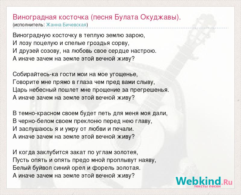 Виноградную косточку в теплую землю зарою, И лозу поцелую и спелые гроздья сорву, И друзей созову, на любовь свое сердце настрою. А иначе зачем на земле этой вечной живу? Собирайтесь-ка гости мои на мое угощенье, Говорите мне прямо в глаза чем пред вами слыву, Царь небесный пошлет мне прощение за прегрешенья. А иначе зачем на земле этой вечной живу? В темно-красном своем будет петь для меня моя дали, В черно-белом своем преклоню перед нею главу, И заслушаюсь я и умру от любви и печали. А иначе зачем на земле этой вечной живу? И когда заклубится закат по углам золотея, Пусть опять и опять предо мной проплывут наяву, Белый буйвол синий орел и форель золотая. А иначе зачем на земле этой вечной живу?